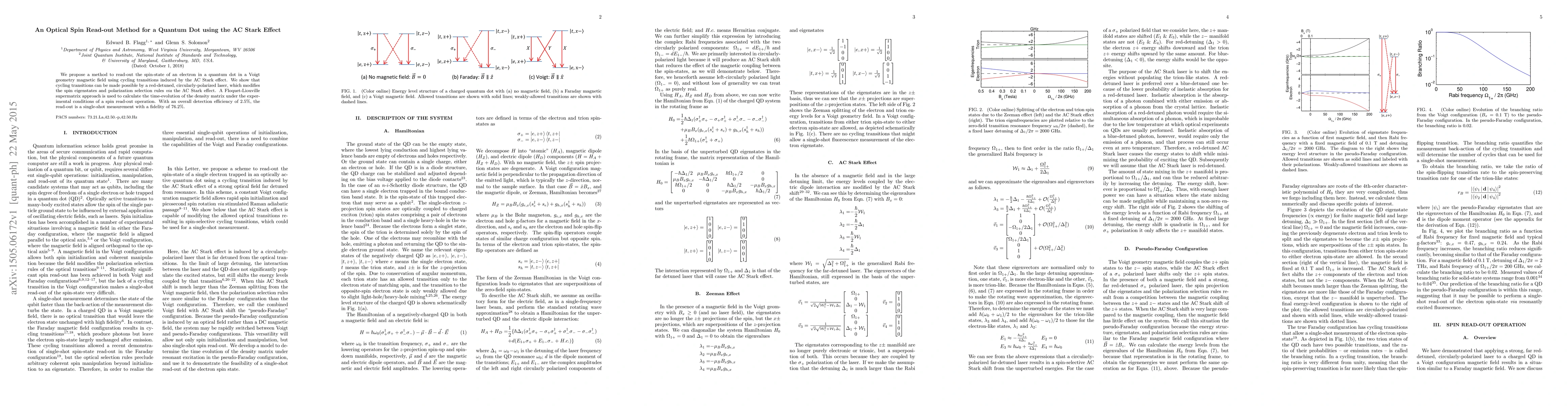 This paper proposes a method for optically reading out the spin state of an electron in a quantum dot using the AC Stark effect in a Voigt geometry. The technique employs a red-detuned, circularly-polarized laser to induce cycling transitions, enabling single-shot measurements with a detection efficiency of 2.5% and a fidelity of 76.2%.