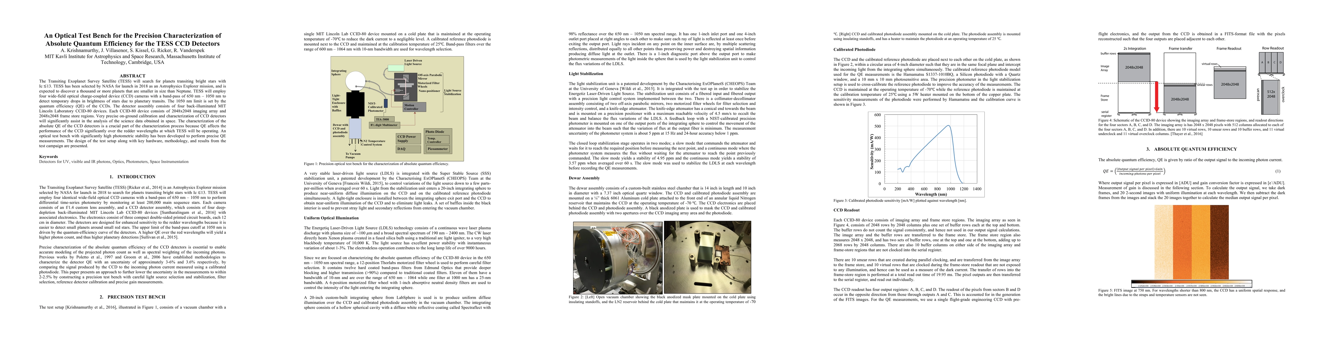 This paper describes the development of an optical test bench for precise characterization of the absolute quantum efficiency of TESS CCD detectors, crucial for the satellite's ability to detect faint planetary transits in the near-infrared spectrum. The test bench achieves high photometric stability, enabling accurate QE measurements essential for the success of the TESS mission.