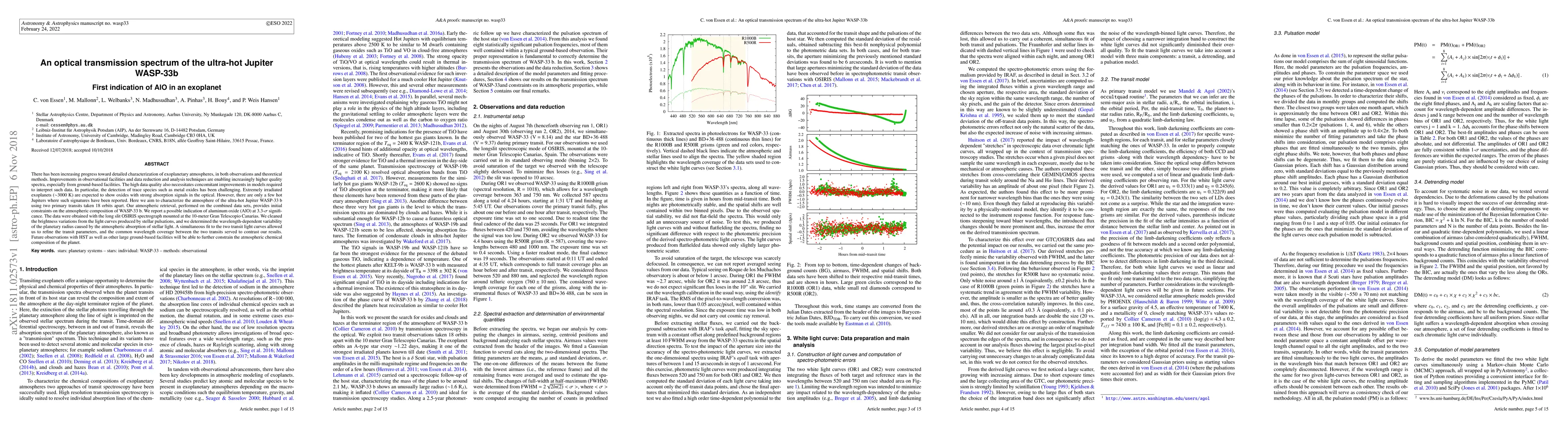 This study characterizes the atmosphere of the ultra-hot Jupiter WASP-33b using high-quality optical spectra, revealing a possible indication of aluminum oxide (AlO) at 3.3-sigma significance. Future observations are needed to confirm this detection and further refine the atmospheric composition.