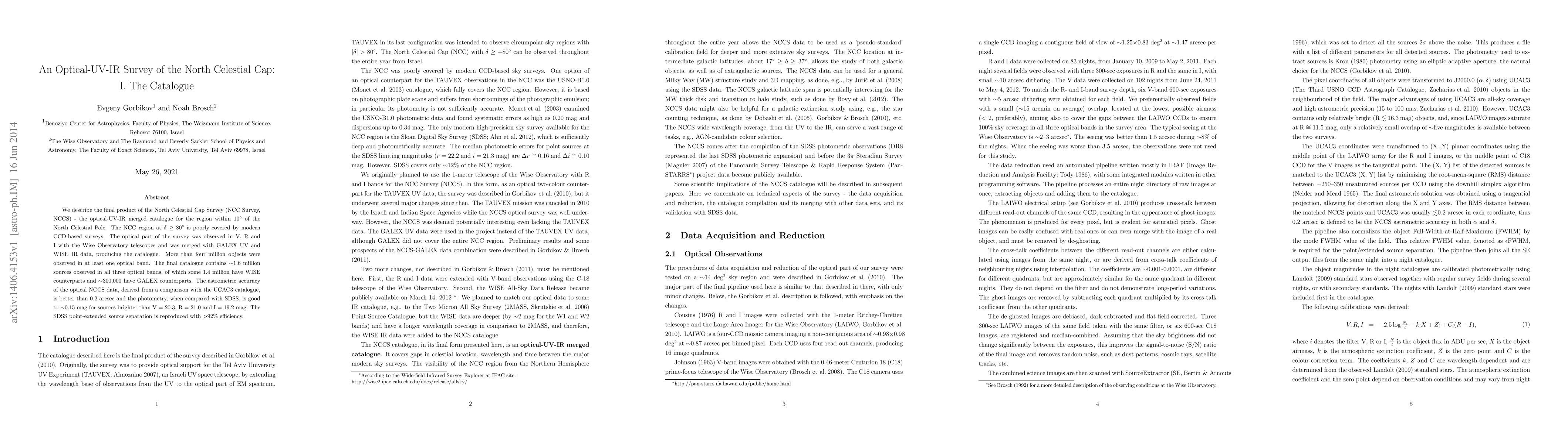 The North Celestial Cap Survey (NCCS) produces a merged catalogue of optical, UV, and IR data for the region near the North Celestial Pole, containing over 1.6 million sources with high astrometric accuracy and precise photometry. The survey combines data from Wise Observatory, GALEX, and WISE, achieving efficient point-extended source separation.