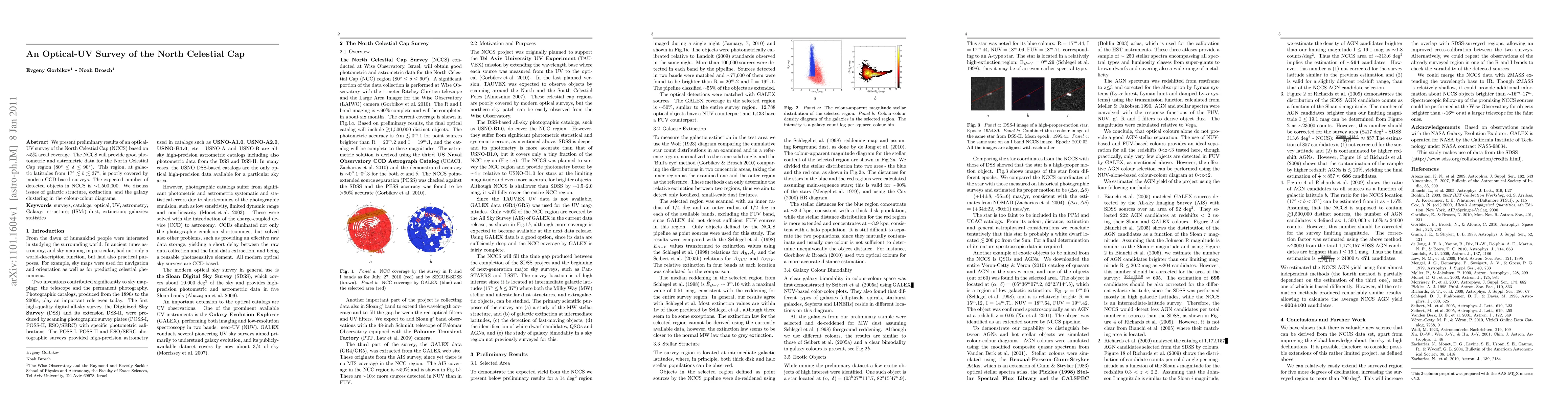 We present preliminary results of an optical-UV survey of the North Celestial Cap (NCCS) based on ~5% areal coverage. The NCCS will provide good photometric and astrometric data for the North Celestial Cap region (80 < DEC < 90). This region, at galactic latitudes 17 < b < 37, is poorly covered by modern CCD-based surveys. The expected number of detected objects in NCCS is ~1,500,000. We discuss issues of galactic structure, extinction, and the galaxy clustering in the colour-colour diagrams.