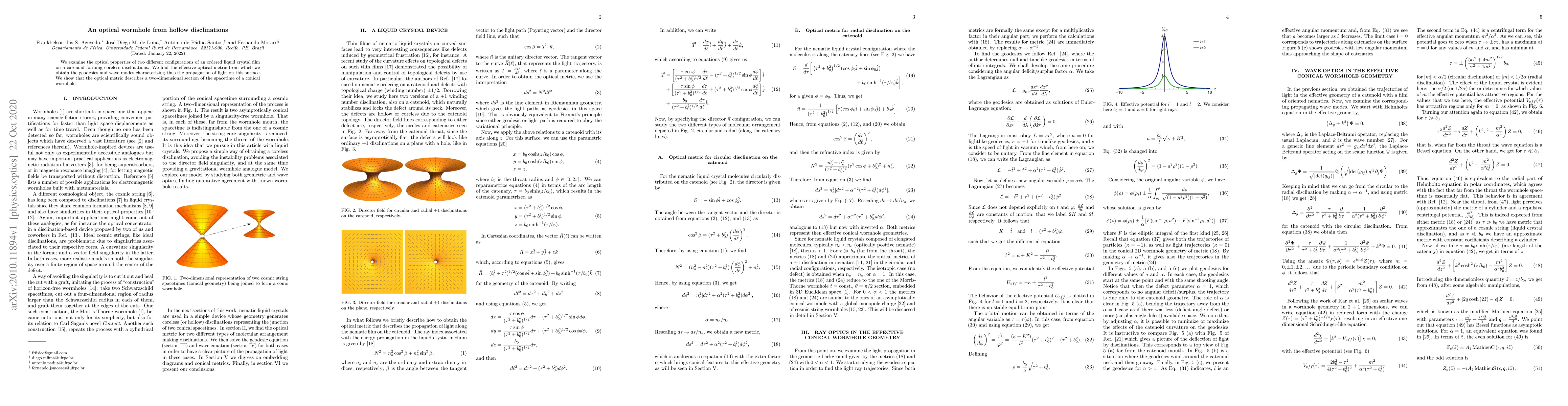 We examine the optical properties of two different configurations of an ordered liquid crystal film on a catenoid forming coreless disclinations. We find the effective optical metric from which we obtain the geodesics and wave modes characterizing thus the propagation of light on this surface. We show that the optical metric describes a two-dimensional section of the spacetime of a conical wormhole.
