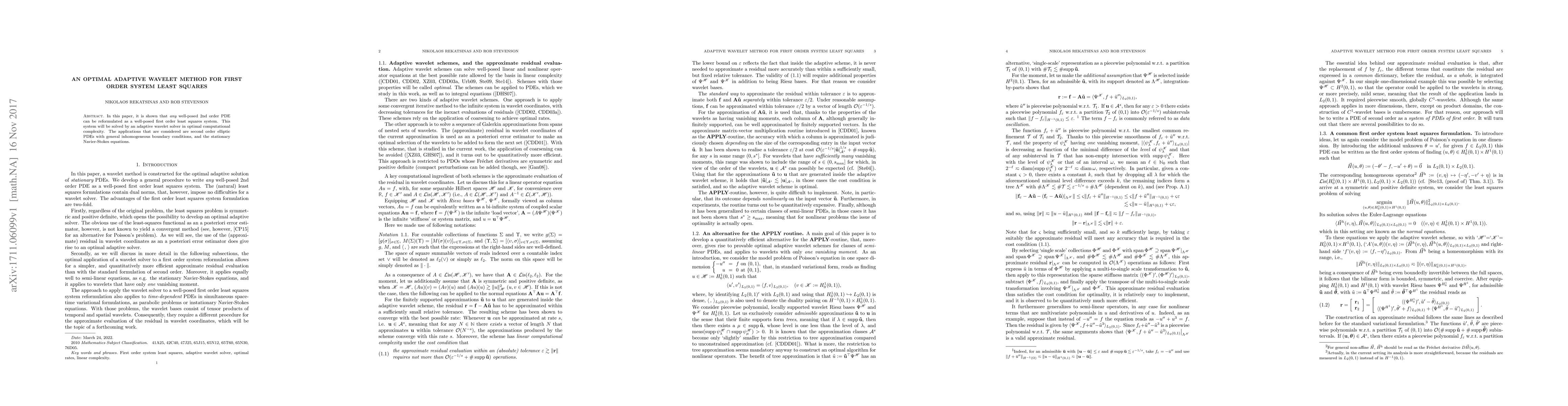 This paper proposes an adaptive wavelet method to solve reformulated first order least squares systems derived from second order PDEs, achieving optimal computational complexity. Applications include second order elliptic PDEs and the stationary Navier-Stokes equations.