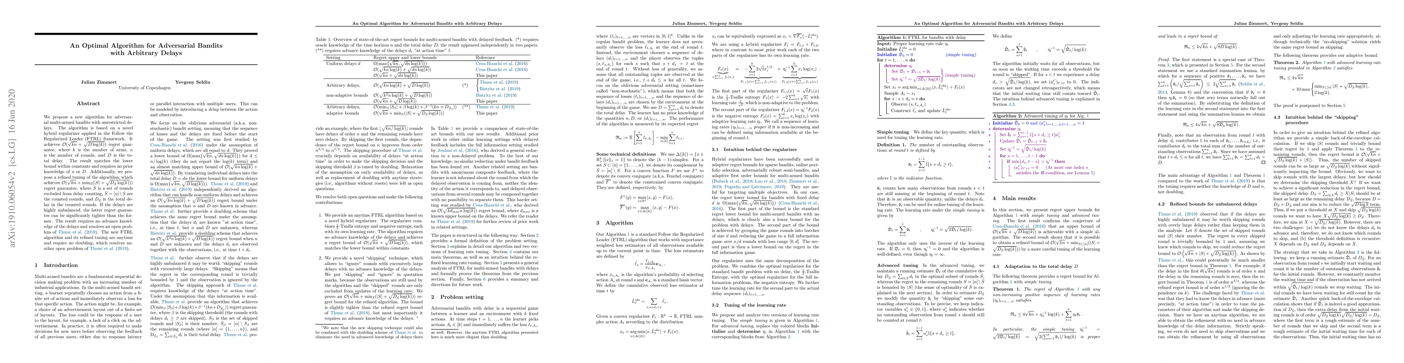 We propose a new algorithm for adversarial multi-armed bandits with unrestricted delays. The algorithm is based on a novel hybrid regularizer applied in the Follow the Regularized Leader (FTRL) framework. It achieves $\mathcal{O}(\sqrt{kn}+\sqrt{D\log(k)})$ regret guarantee, where $k$ is the number of arms, $n$ is the number of rounds, and $D$ is the total delay. The result matches the lower bound within constants and requires no prior knowledge of $n$ or $D$. Additionally, we propose a refined tuning of the algorithm, which achieves $\mathcal{O}(\sqrt{kn}+\min_{S}|S|+\sqrt{D_{\bar S}\log(k)})$ regret guarantee, where $S$ is a set of rounds excluded from delay counting, $\bar S = [n]\setminus S$ are the counted rounds, and $D_{\bar S}$ is the total delay in the counted rounds. If the delays are highly unbalanced, the latter regret guarantee can be significantly tighter than the former. The result requires no advance knowledge of the delays and resolves an open problem of Thune et al. (2019). The new FTRL algorithm and its refined tuning are anytime and require no doubling, which resolves another open problem of Thune et al. (2019).