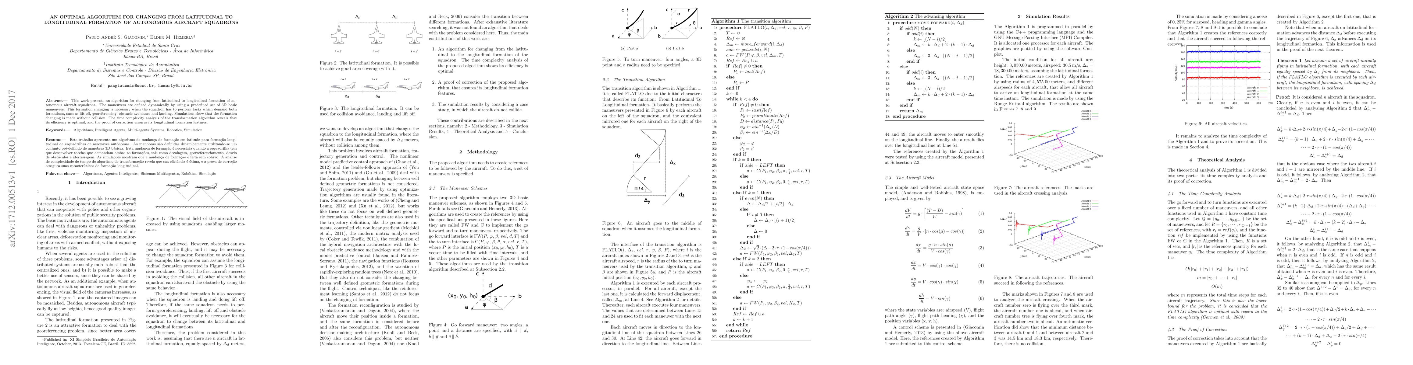 This work presents an algorithm for changing from latitudinal to longitudinal formation of autonomous aircraft squadrons. The maneuvers are defined dynamically by using a predefined set of 3D basic maneuvers. This formation changing is necessary when the squadron has to perform tasks which demand both formations, such as lift off, georeferencing, obstacle avoidance and landing. Simulations show that the formation changing is made without collision. The time complexity analysis of the transformation algorithm reveals that its efficiency is optimal, and the proof of correction ensures its longitudinal formation features.