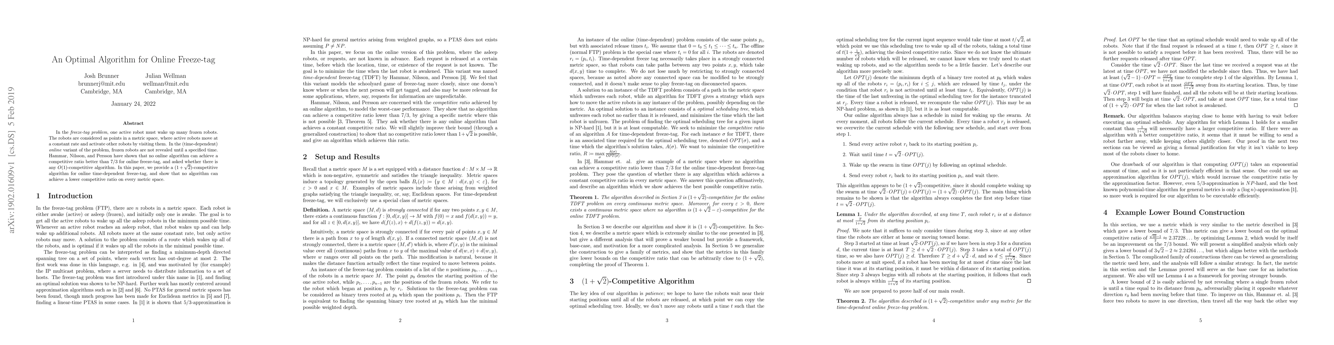 This paper presents a $(1+\sqrt{2})$-competitive algorithm for the online freeze-tag problem, where an active robot must wake up many frozen robots in a metric space. It also proves that no algorithm can achieve a better competitive ratio across all metric spaces.