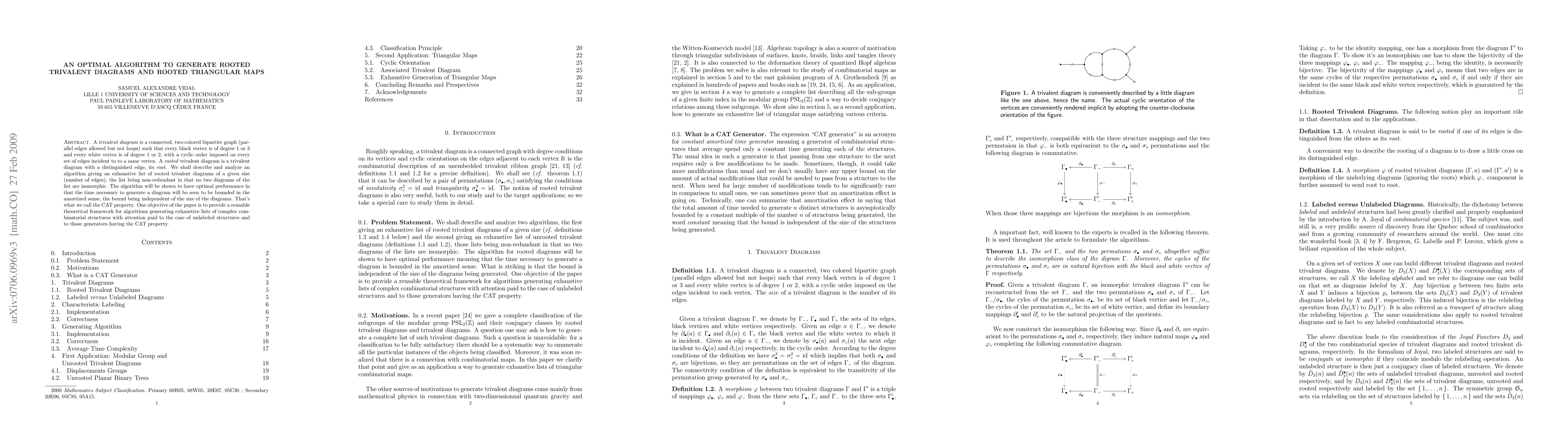 A trivalent diagram is a connected, two-colored bipartite graph (parallel edges allowed but not loops) such that every black vertex is of degree 1 or 3 and every white vertex is of degree 1 or 2, with a cyclic order imposed on every set of edges incident to to a same vertex. A rooted trivalent diagram is a trivalent diagram with a distinguished edge, its root. We shall describe and analyze an algorithm giving an exhaustive list of rooted trivalent diagrams of a given size (number of edges), the list being non-redundant in that no two diagrams of the list are isomorphic. The algorithm will be shown to have optimal performance in that the time necessary to generate a diagram will be seen to be bounded in the amortized sense, the bound being independent of the size of the diagrams. That's what we call the CAT property. One objective of the paper is to provide a reusable theoretical framework for algorithms generating exhaustive lists of complex combinatorial structures with attention paid to the case of unlabeled structures and to those generators having the CAT property.