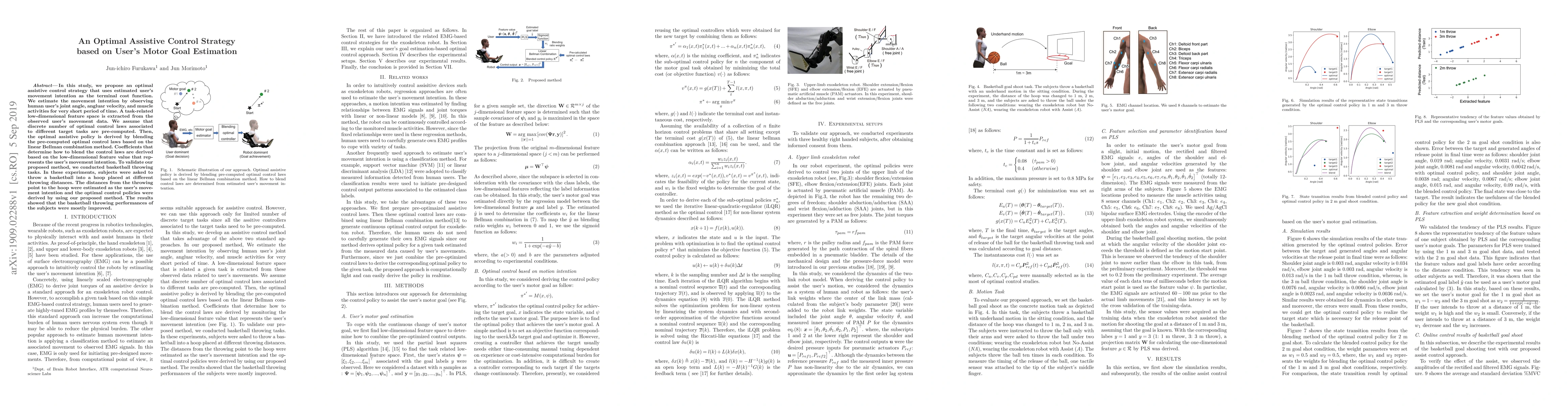 In this study, we propose an optimal assistive control strategy that uses estimated user's movement intention as the terminal cost function. We estimate the movement intention by observing human user's joint angle, angluar velocity, and muscle activities for very short period of time. A task-related low-dimensional feature space is extracted from the observed user's movement data. We assume that discrete number of optimal control laws associated to different target tasks are pre-computed. Then, the optimal assistive policy is derived by blending the pre-computed optimal control laws based on the linear Bellman combination method. Coefficients that determine how to blend the control laws are derived based on the low-dimensional feature value that represents the user's movement intention. To validate our proposed method, we conducted basketball throwing tasks. In these experiments, subjects were asked to throw a basketball into a hoop placed at different throwing distances. The distances from the throwing point to the hoop were estimated as the user's movement intention and the optimal control policies were derived by using our proposed method. The results showed that the basketball throwing performances of the subjects were mostly improved.
