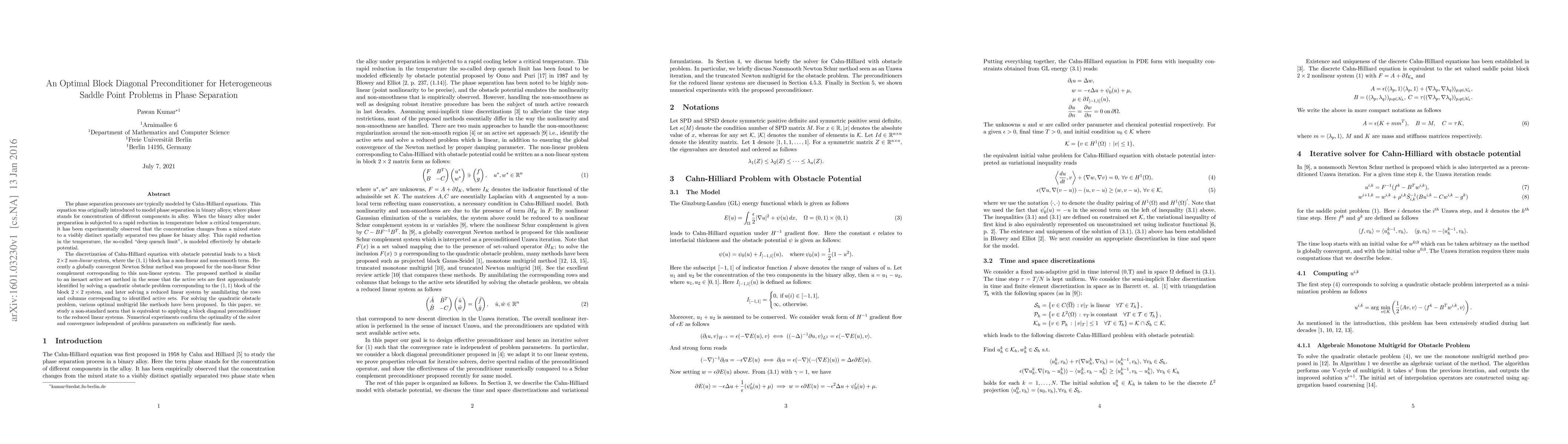 This paper presents an optimal block diagonal preconditioner for solving linear systems arising from a non-linear Cahn-Hilliard equation modeling phase separation in binary alloys. The method identifies active sets via a quadratic obstacle problem and solves reduced linear systems with a block diagonal preconditioner, demonstrating optimality and convergence independent of problem parameters in numerical experiments.