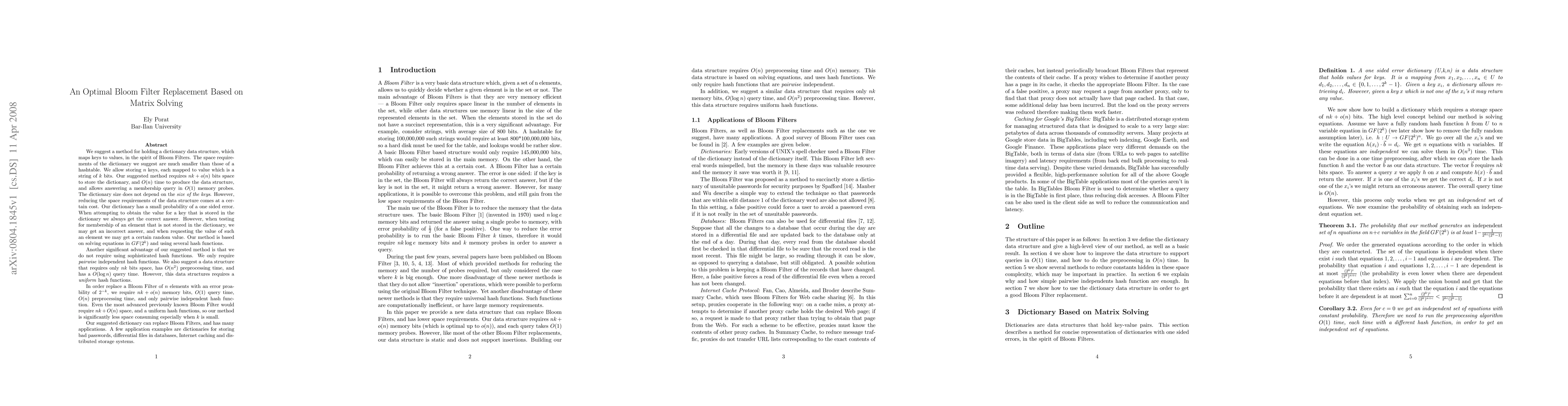 This paper proposes a new dictionary data structure inspired by Bloom Filters, requiring significantly less space. The method uses matrix solving in GF(2^k) and requires only pairwise independent hash functions, achieving nk + o(n) bits space and O(1) query time, with a small probability of one-sided error.