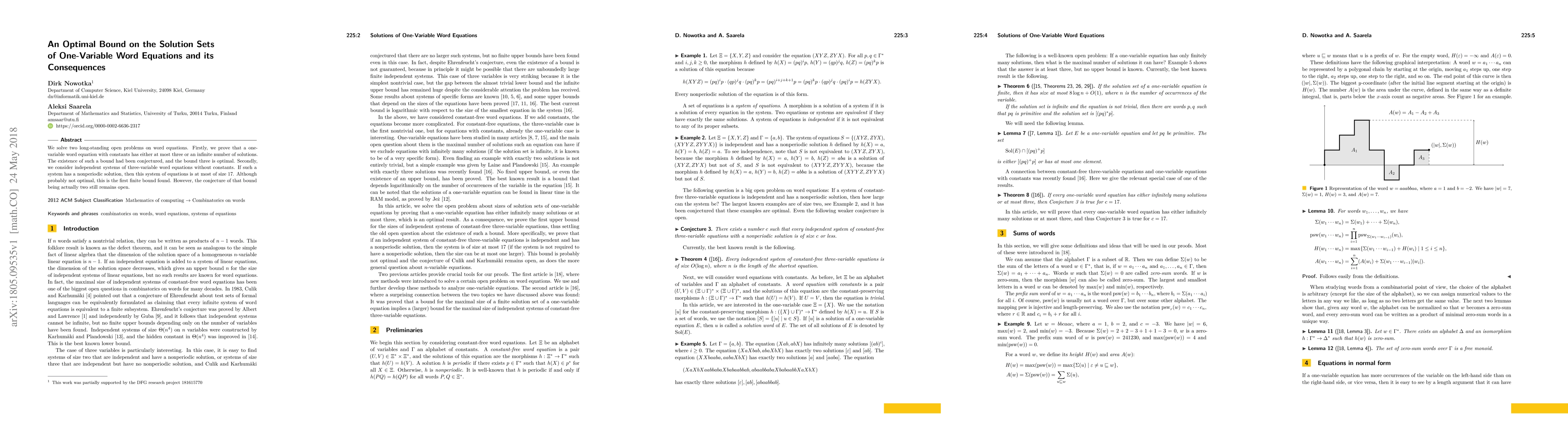 We solve two long-standing open problems on word equations. Firstly, we prove that a one-variable word equation with constants has either at most three or an infinite number of solutions. The existence of such a bound had been conjectured, and the bound three is optimal. Secondly, we consider independent systems of three-variable word equations without constants. If such a system has a nonperiodic solution, then this system of equations is at most of size 17. Although probably not optimal, this is the first finite bound found. However, the conjecture of that bound being actually two still remains open.