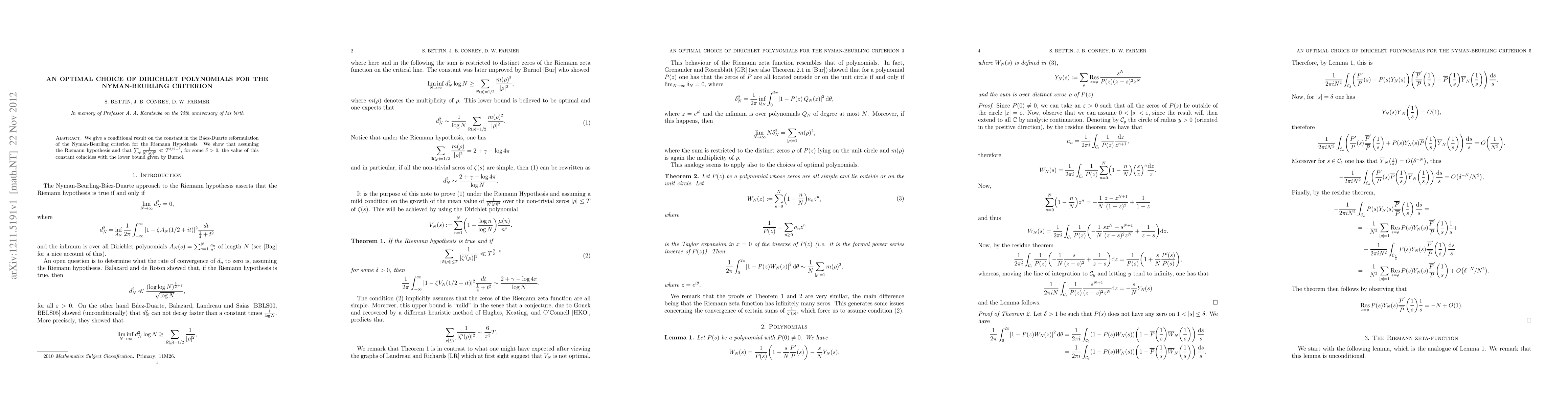 We give a conditional result on the constant in the B\'aez-Duarte reformulation of the Nyman-Beurling criterion for the Riemann Hypothesis. We show that assuming the Riemann hypothesis and that $\sum_{\rho}\frac{1}{|\zeta'(\rho)|^2}\ll T^{3/2-\delta}$, for some $\delta>0$, the value of this constant coincides with the lower bound given by Burnol.