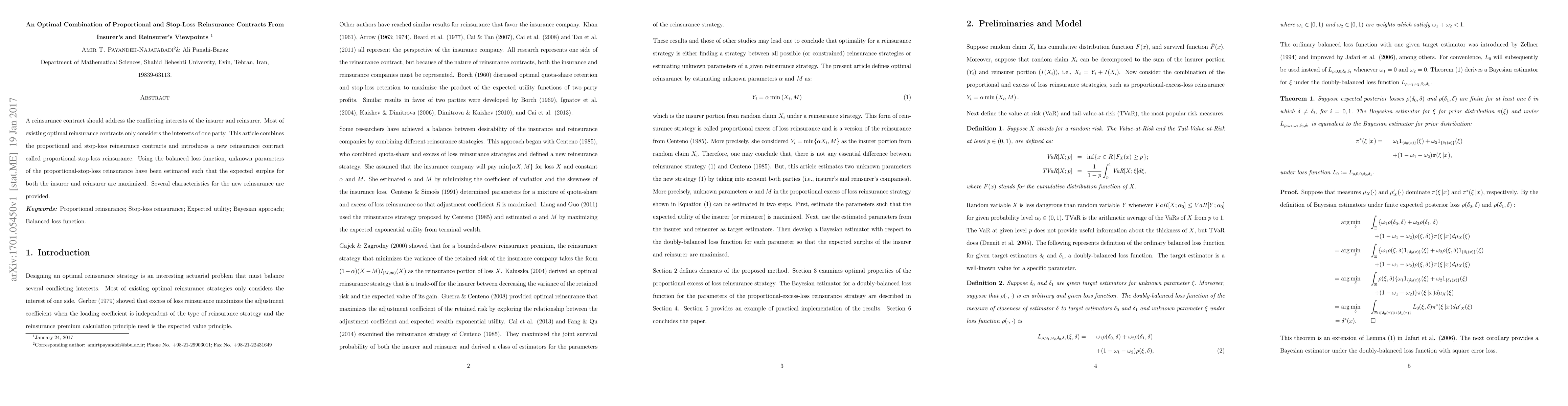 A reinsurance contract should address the conflicting interests of the insurer and reinsurer. Most of existing optimal reinsurance contracts only considers the interests of one party. This article combines the proportional and stop-loss reinsurance contracts and introduces a new reinsurance contract called proportional-stop-loss reinsurance. Using the balanced loss function, unknown parameters of the proportional-stop-loss reinsurance have been estimated such that the expected surplus for both the insurer and reinsurer are maximized. Several characteristics for the new reinsurance are provided.