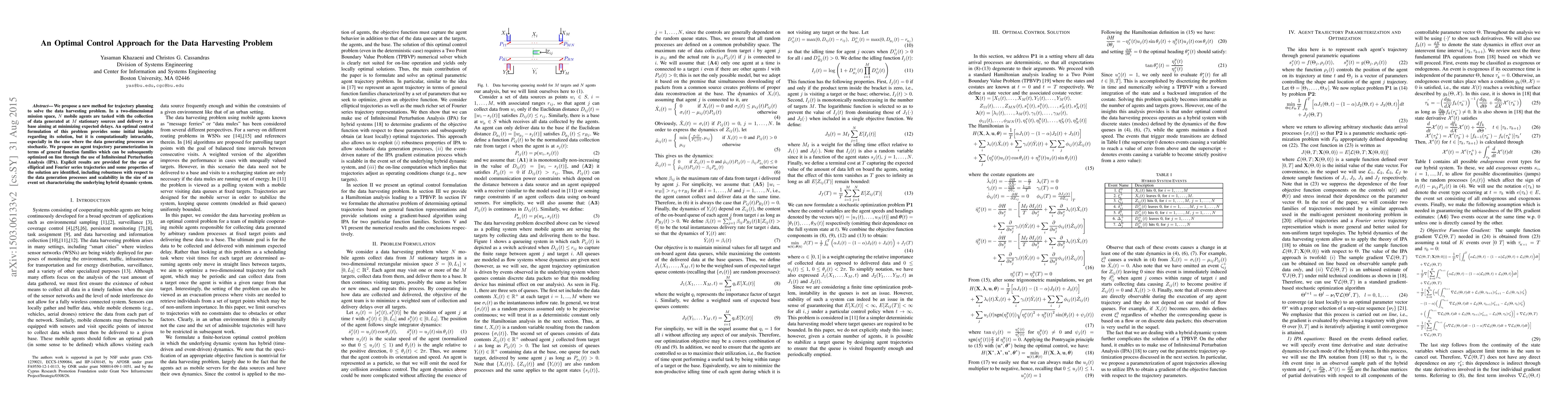 We propose a new method for trajectory planning to solve the data harvesting problem. In a two-dimensional mission space, $N$ mobile agents are tasked with the collection of data generated at $M$ stationary sources and delivery to a base aiming at minimizing expected delays. An optimal control formulation of this problem provides some initial insights regarding its solution, but it is computationally intractable, especially in the case where the data generating processes are stochastic. We propose an agent trajectory parameterization in terms of general function families which can be subsequently optimized on line through the use of Infinitesimal Perturbation Analysis (IPA). Explicit results are provided for the case of elliptical and Fourier series trajectories and some properties of the solution are identified, including robustness with respect to the data generation processes and scalability in the size of an event set characterizing the underlying hybrid dynamic system.