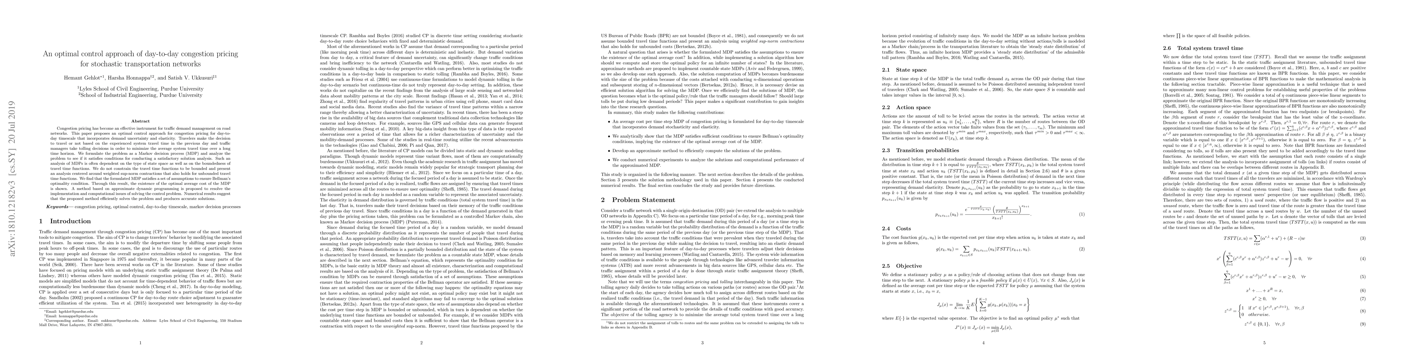This paper proposes an optimal control approach for congestion pricing in stochastic transportation networks, incorporating demand uncertainty and elasticity. It formulates the problem as a Markov decision process (MDP) and demonstrates the existence of an optimal average cost using weighted sup-norm contractions, proposing an approximate dynamic programming method for practical implementation.
