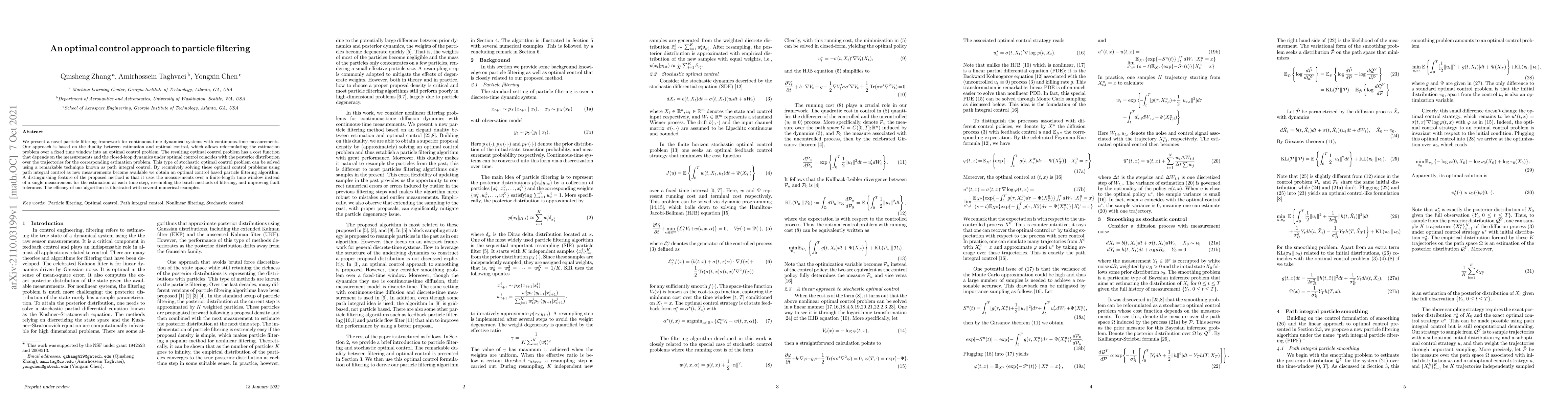 We present a novel particle filtering framework for continuous-time dynamical systems with continuous-time measurements. Our approach is based on the duality between estimation and optimal control, which allows reformulating the estimation problem over a fixed time window into an optimal control problem. The resulting optimal control problem has a cost function that depends on the measurements and the closed-loop dynamics under optimal control coincides with the posterior distribution over the trajectories for the corresponding estimation problem. This type of stochastic optimal control problem can be solved using a remarkable technique known as path integral control. By recursively solving these optimal control problems using path integral control as new measurements become available we obtain an optimal control-based particle filtering algorithm. A distinguishing feature of the proposed method is that it uses the measurements over a finite-length time window instead of a single measurement for the estimation at each time step, resembling the batch methods of filtering, and improving fault tolerance. The efficacy of our algorithm is illustrated with several numerical examples.