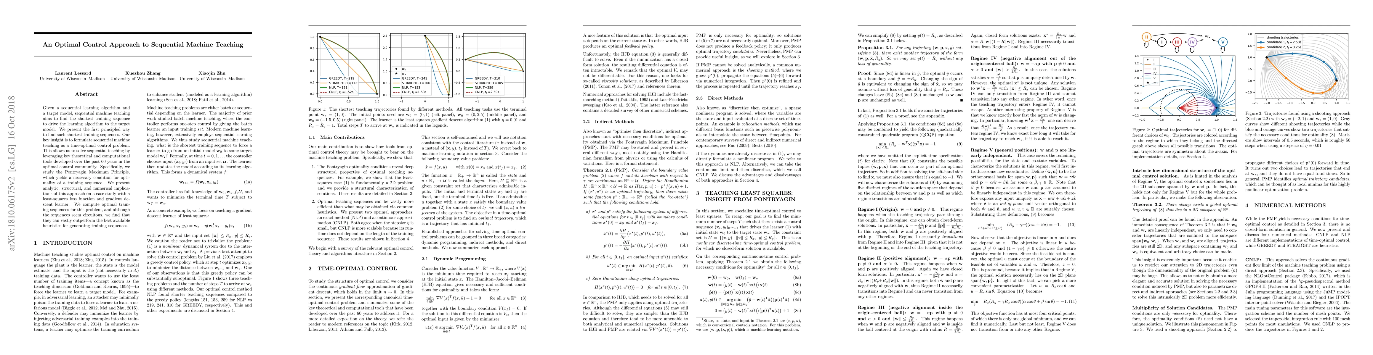 This paper proposes an optimal control approach to sequentially teach a machine learning algorithm to a target model by finding the shortest training sequence. It leverages the Pontryagin Maximum Principle to derive necessary optimality conditions and demonstrates superior performance of the computed optimal sequences over existing heuristics.
