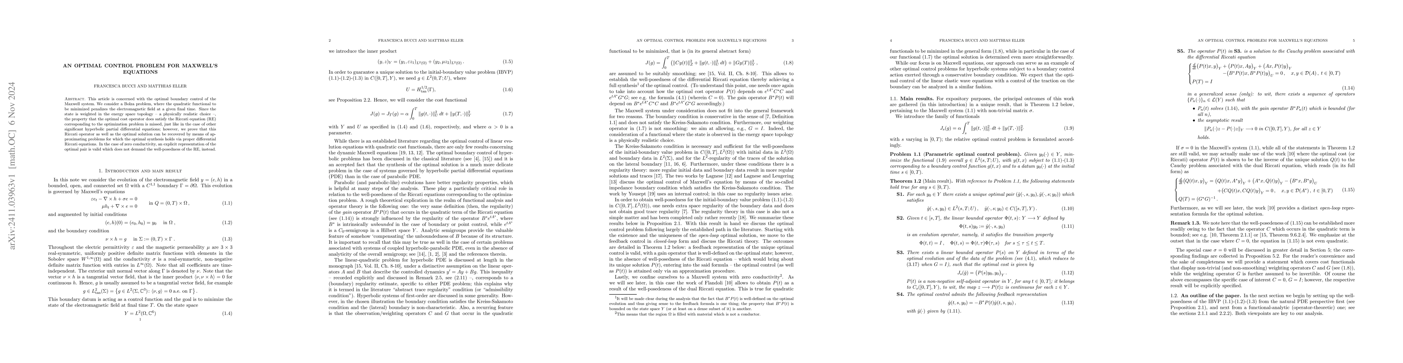 This paper investigates optimal boundary control for Maxwell's equations, focusing on minimizing a quadratic functional penalizing the electromagnetic field at a final time. Despite the optimal cost operator not satisfying the Riccati equation, the authors prove the recovery of the Riccati operator and optimal solution via approximating problems, and provide an explicit optimal pair representation for zero conductivity cases.