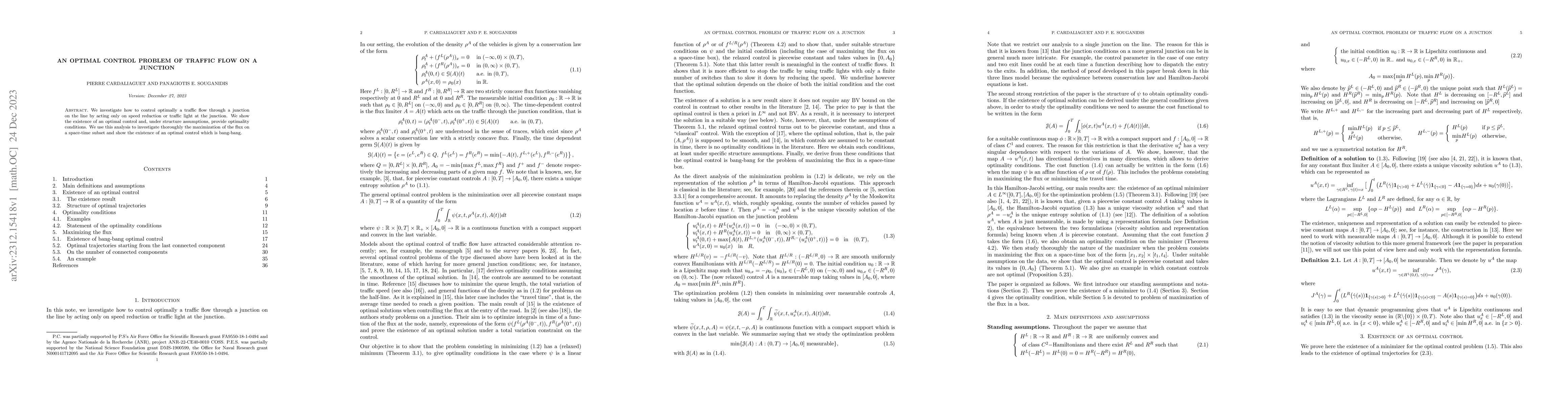 This paper explores optimal control strategies for managing traffic flow at a junction, focusing on speed reduction and traffic light adjustments. It establishes the existence of an optimal control and provides conditions for optimality, demonstrating the maximization of traffic flux through a bang-bang control approach.