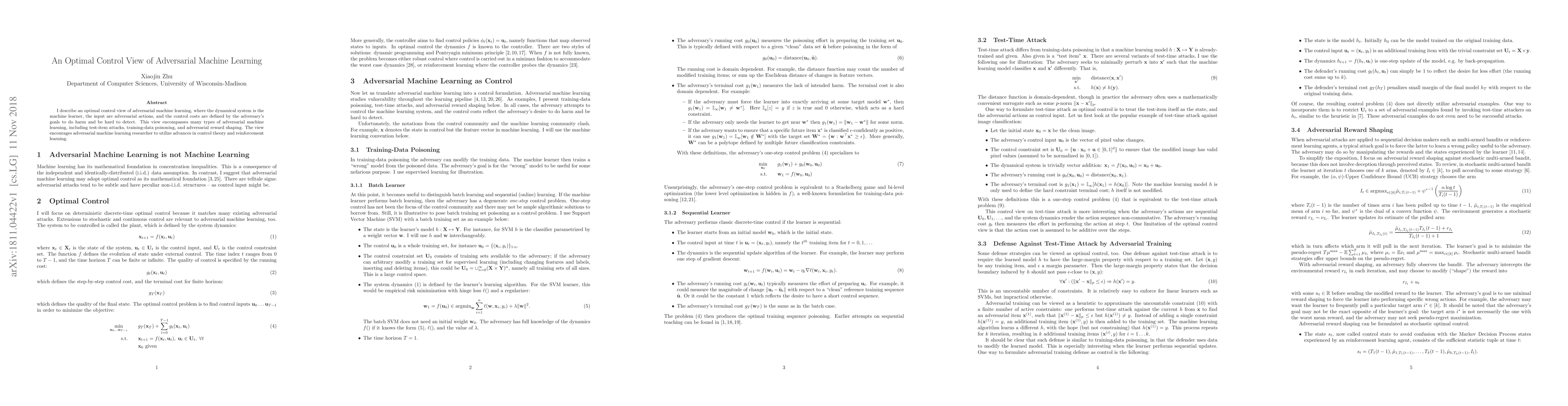 This paper presents an optimal control framework for adversarial machine learning, treating the machine learner as a dynamical system influenced by adversarial actions, with control costs reflecting the adversary's objectives of causing harm and remaining undetected. It suggests leveraging control theory and reinforcement learning to advance adversarial research.
