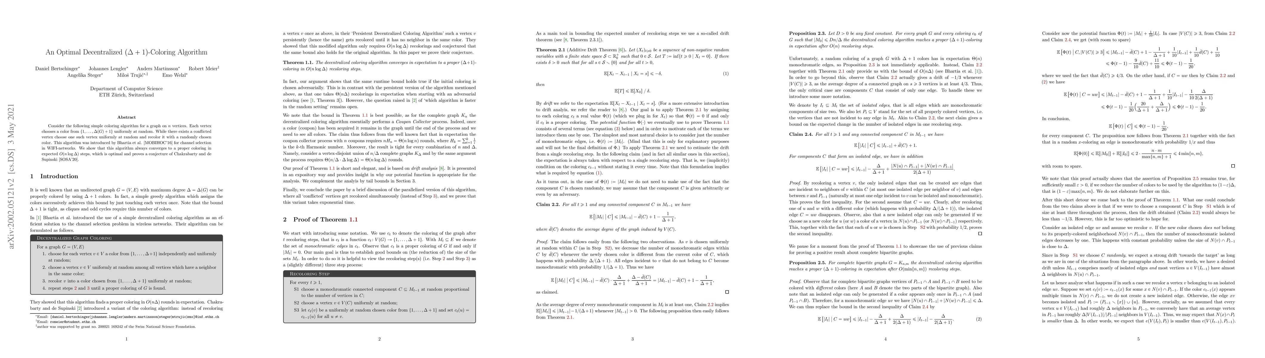 This paper presents a decentralized $(\Delta + 1)$-coloring algorithm that converges to a proper coloring in expected $O(n \log \Delta)$ steps, proving the optimality of the approach and resolving a conjecture by Chakrabarty and Supinski. The algorithm was originally introduced for channel selection in WIFI networks.