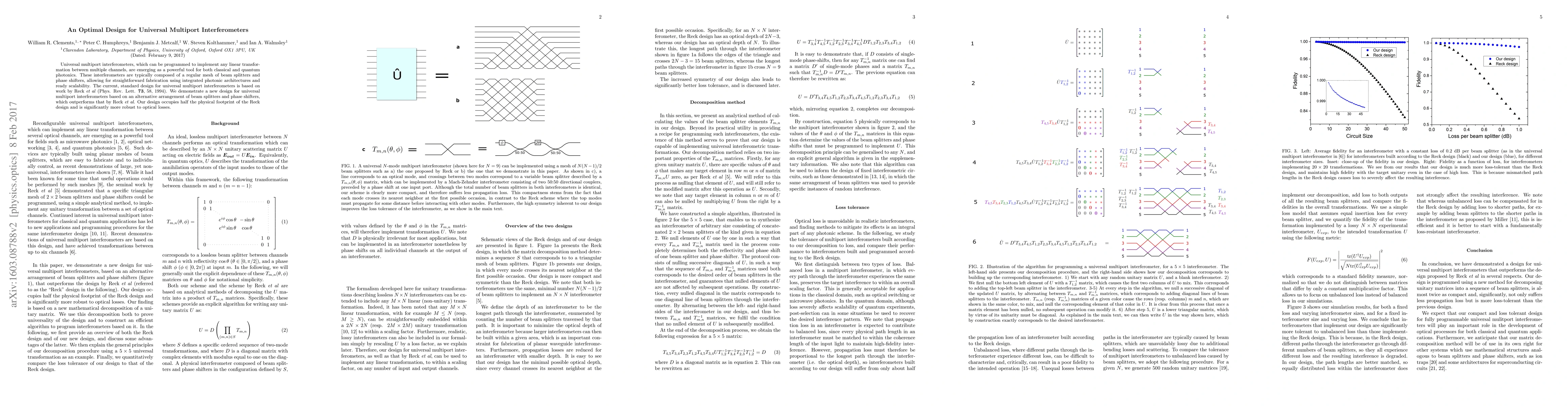 This paper presents a novel design for universal multiport interferometers that outperforms the standard Reck design by utilizing a different arrangement of beam splitters and phase shifters, resulting in a smaller footprint and greater robustness against optical losses.