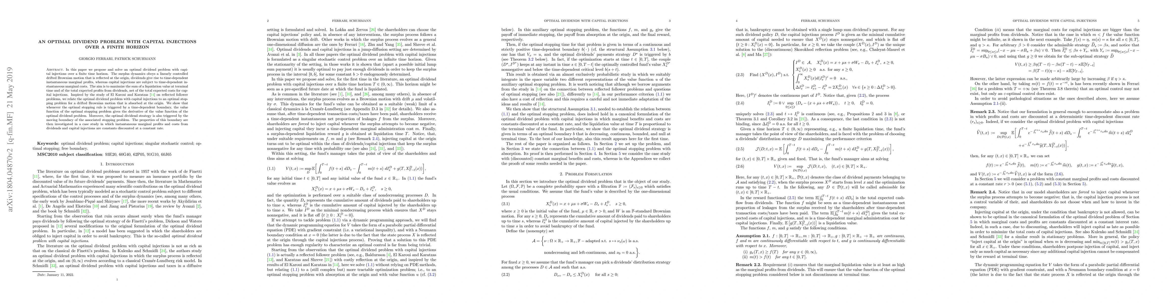 This paper proposes and solves an optimal dividend problem with capital injections over a finite time horizon, showing that the optimal dividend strategy mirrors the optimal stopping problem for a drifted Brownian motion absorbed at the origin. The value function of the stopping problem provides the derivative of the dividend problem's value function, and both are governed by a time-dependent boundary.