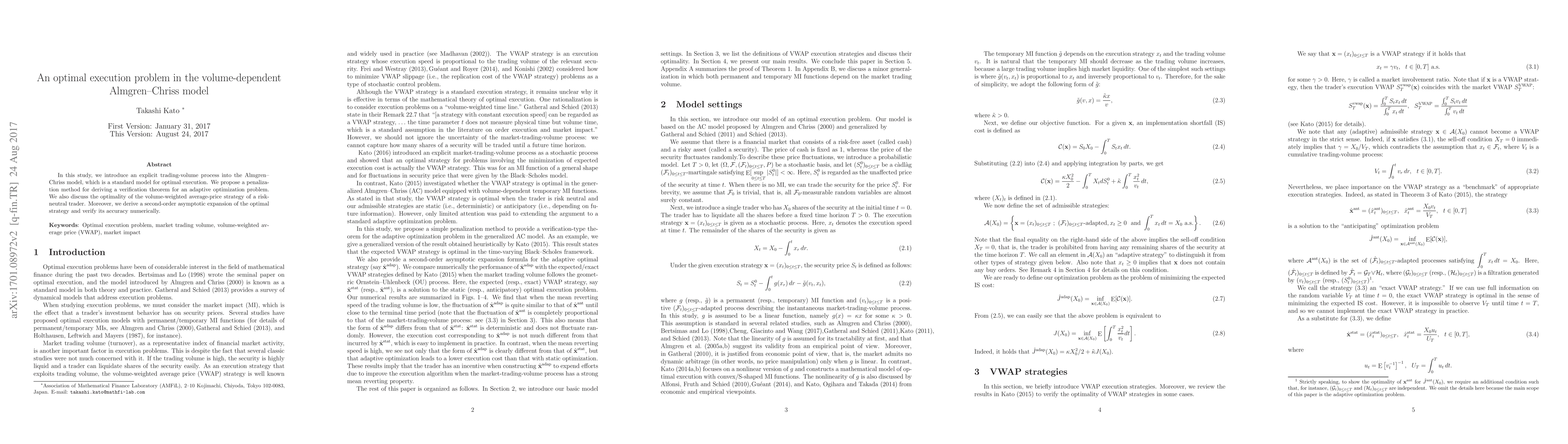 This paper enhances the Almgren-Chriss model by incorporating a trading-volume process, proposing a penalization method to derive a verification theorem for adaptive optimization. It also examines the optimality of a volume-weighted average-price strategy and verifies the accuracy of a second-order asymptotic expansion of the optimal strategy through numerical analysis.