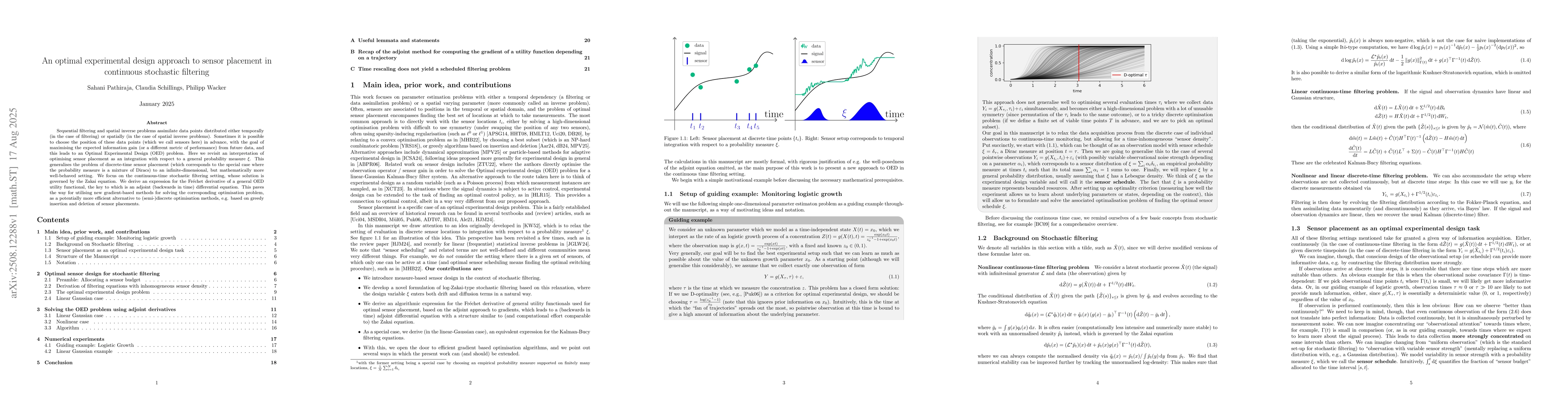 Sequential filtering and spatial inverse problems assimilate data points distributed either temporally (in the case of filtering) or spatially (in the case of spatial inverse problems). Sometimes it is possible to choose the position of these data points (which we call sensors here) in advance, with the goal of maximising the expected information gain (or a different metric of performance) from future data, and this leads to an Optimal Experimental Design (OED) problem. Here we revisit an interpretation of optimising sensor placement as an integration with respect to a general probability measure $\xi$. This generalises the problem of discrete-time sensor placement (which corresponds to the special case where the probability measure is a mixture of Diracs) to an infinite-dimensional, but mathematically more well-behaved setting. We focus on the continuous-time stochastic filtering setting, whose solution is governed by the Zakai equation. We derive an expression for the Fr\'echet derivative of a general OED utility functional, the key to which is an adjoint (backwards in time) differential equation. This paves the way for utilising new gradient-based methods for solving the corresponding optimisation problem, as a potentially more efficient alternative to (semi-)discrete optimisation methods, e.g. based on greedy insertion and deletion of sensor placements.