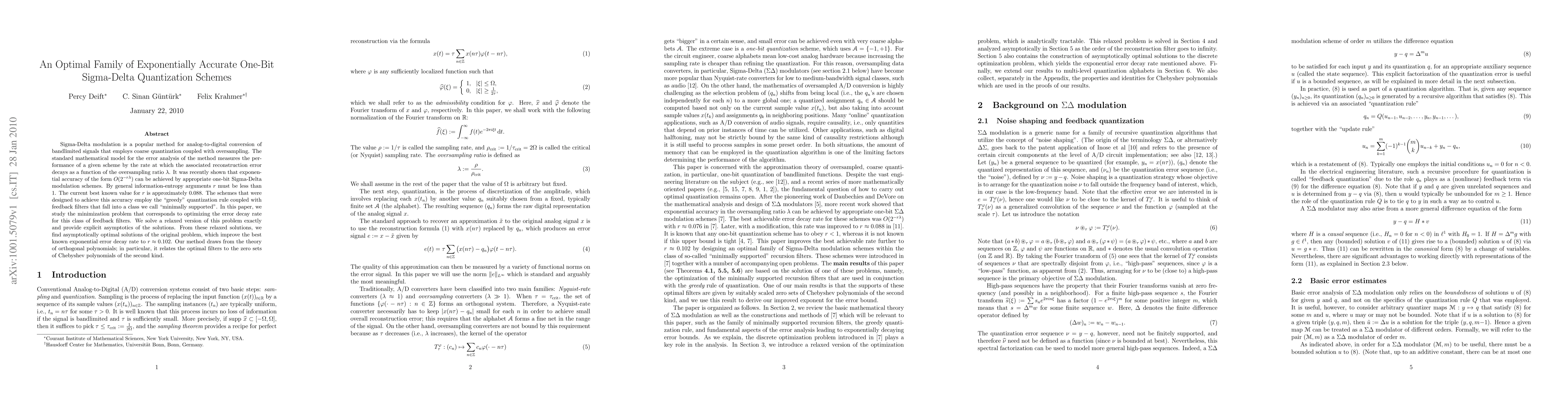 This paper develops an optimal family of exponentially accurate one-bit Sigma-Delta quantization schemes, improving the best-known error decay rate from approximately 0.088 to 0.102. The authors utilize the theory of orthogonal polynomials, specifically relating optimal filters to the zero sets of Chebyshev polynomials of the second kind.