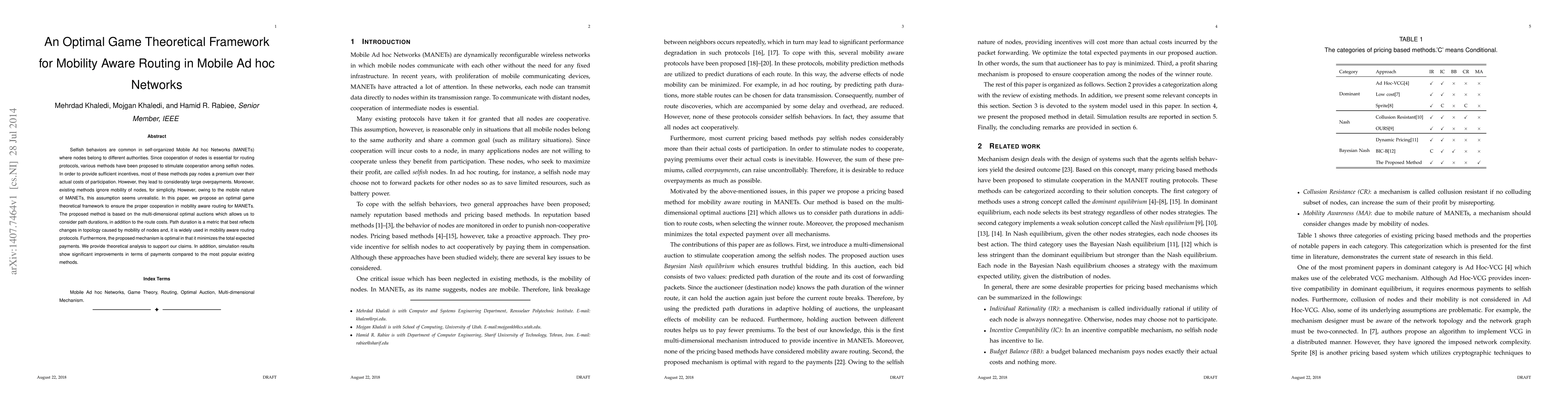 This paper proposes an optimal game theoretical framework for mobility aware routing in MANETs, using multi-dimensional optimal auctions to incentivize cooperation while minimizing overpayments and considering node mobility. Theoretical analysis and simulations demonstrate significant improvements over existing methods.