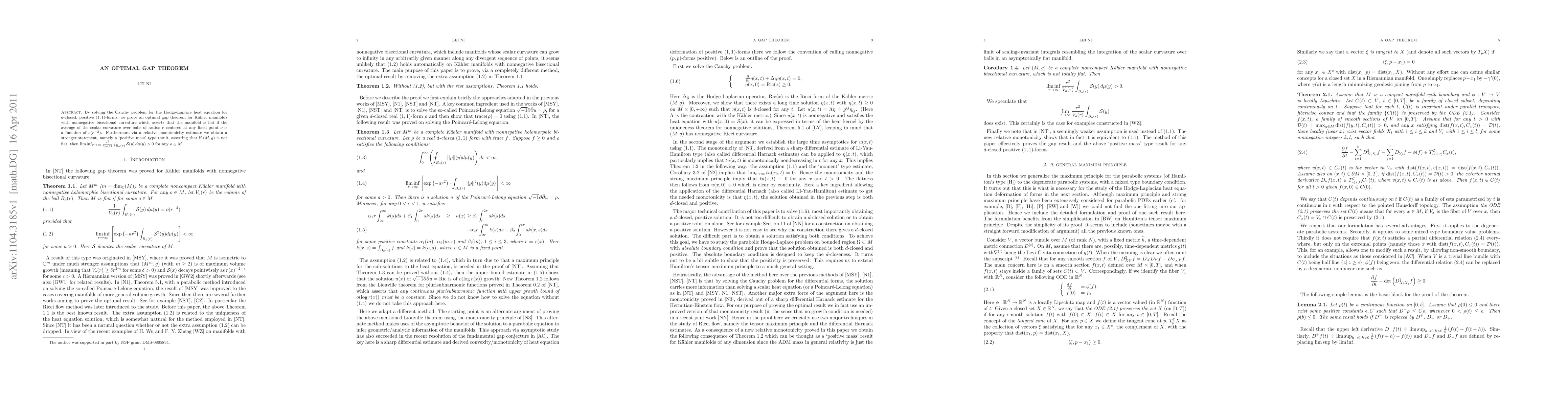 By solving the Cauchy problem for the Hodge-Laplace heat equation for $d$-closed, positive $(1, 1)$-forms, we prove an optimal gap theorem for K\"ahler manifolds with nonnegative bisectional curvature which asserts that the manifold is flat if the average of the scalar curvature over balls of radius $r$ centered at any fixed point $o$ is a function of $o(r^{-2})$. Furthermore via a relative monotonicity estimate we obtain a stronger statement, namely a `positive mass' type result, asserting that if $(M, g)$ is not flat, then $\liminf_{r\to \infty} \frac{r^2}{V_o(r)}\int_{B_o(r)}\mathcal{S}(y)\, d\mu(y)>0$ for any $o\in M$.