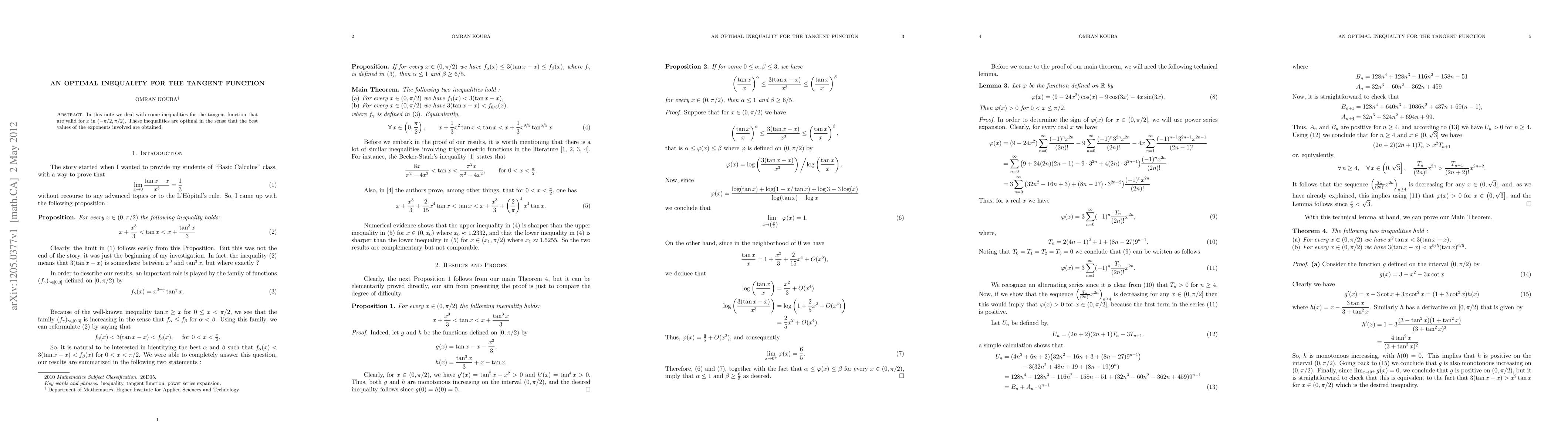 This paper finds optimal inequalities for the tangent function that apply to $x$ in $(-rac{ heta}{2}, rac{ heta}{2})$, providing a way to bound the function within this range.