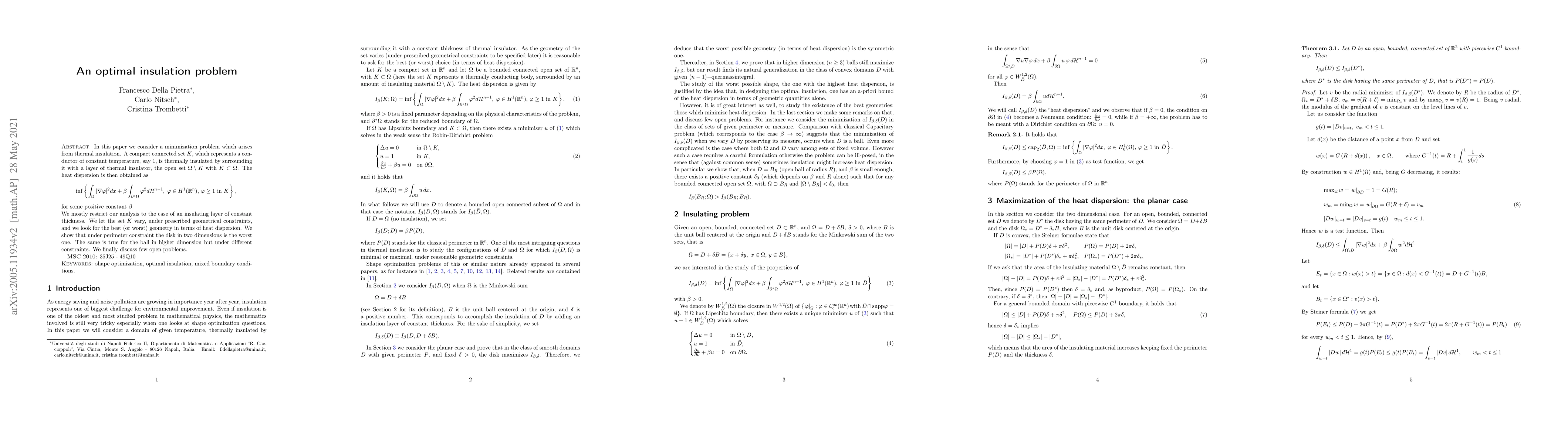 This paper studies the optimal insulation problem to minimize heat dispersion in a conductor surrounded by a thermal insulator of constant thickness. It finds that under perimeter constraint, the disk is the worst geometry for heat dispersion in two dimensions.