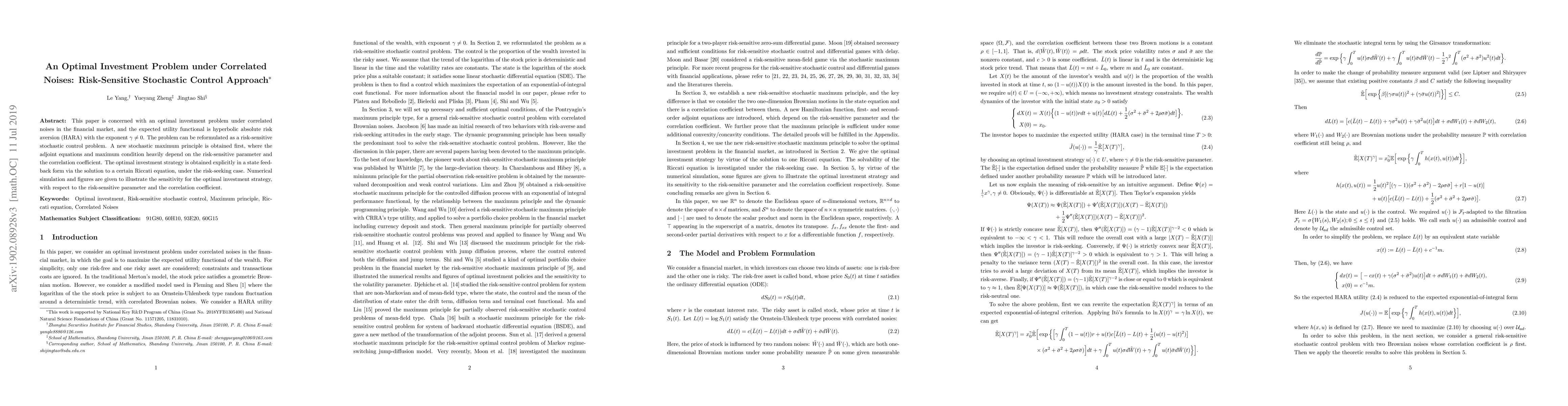 This paper addresses an optimal investment problem under correlated market noises using a risk-sensitive stochastic control approach. It derives a new stochastic maximum principle and obtains an explicit state feedback optimal investment strategy, illustrated through numerical simulations.