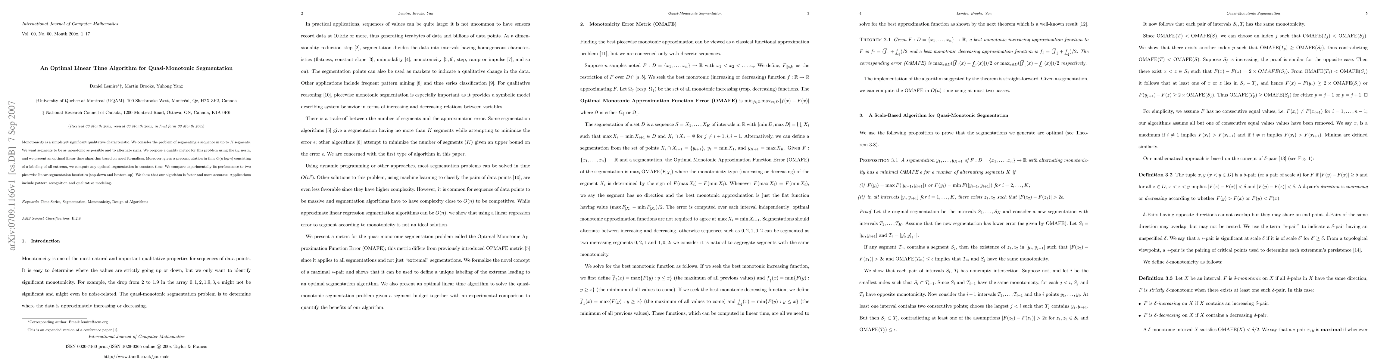 Monotonicity is a simple yet significant qualitative characteristic. We consider the problem of segmenting a sequence in up to K segments. We want segments to be as monotonic as possible and to alternate signs. We propose a quality metric for this problem using the l_inf norm, and we present an optimal linear time algorithm based on novel formalism. Moreover, given a precomputation in time O(n log n) consisting of a labeling of all extrema, we compute any optimal segmentation in constant time. We compare experimentally its performance to two piecewise linear segmentation heuristics (top-down and bottom-up). We show that our algorithm is faster and more accurate. Applications include pattern recognition and qualitative modeling.