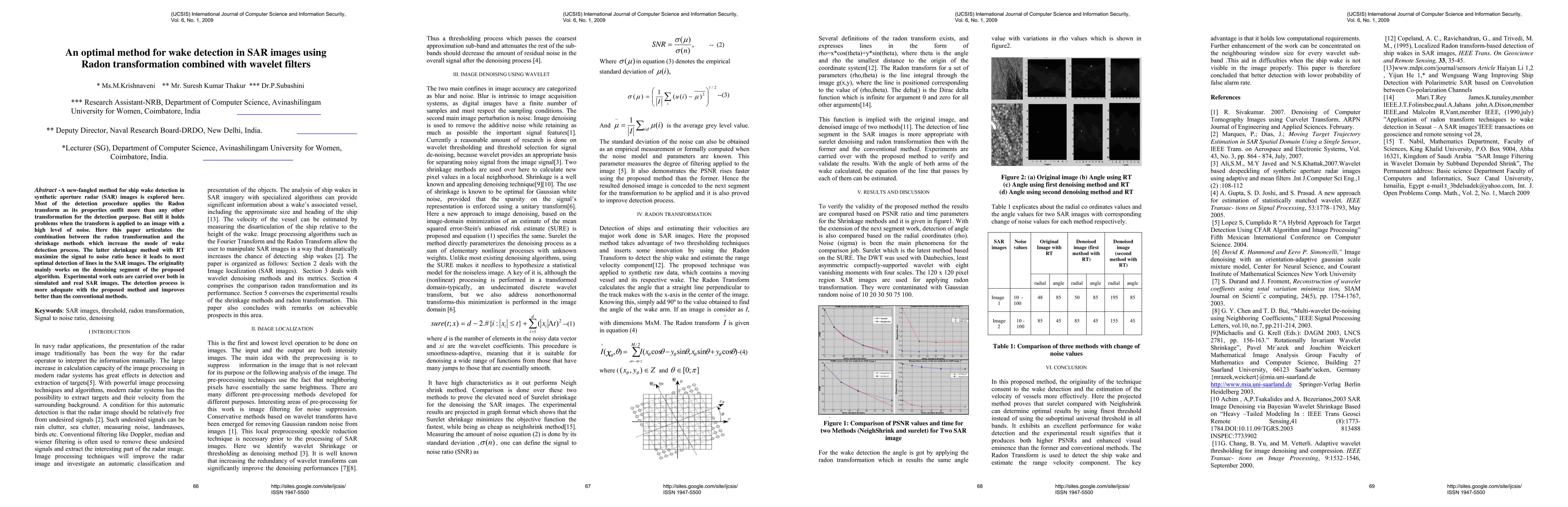 A new fangled method for ship wake detection in synthetic aperture radar (SAR) images is explored here. Most of the detection procedure applies the Radon transform as its properties outfit more than any other transformation for the detection purpose. But still it holds problems when the transform is applied to an image with a high level of noise. Here this paper articulates the combination between the radon transformation and the shrinkage methods which increase the mode of wake detection process. The latter shrinkage method with RT maximize the signal to noise ratio hence it leads to most optimal detection of lines in the SAR images. The originality mainly works on the denoising segment of the proposed algorithm. Experimental work outs are carried over both in simulated and real SAR images. The detection process is more adequate with the proposed method and improves better than the conventional methods.