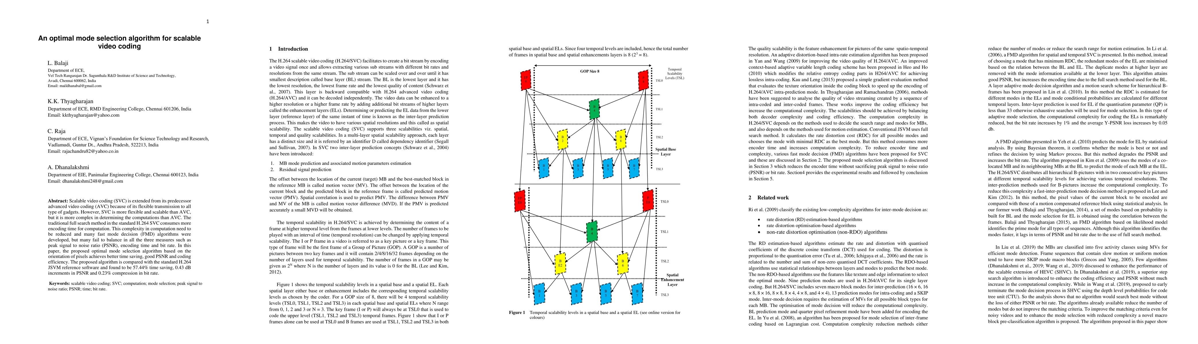 This paper proposes an optimal mode selection algorithm for scalable video coding (SVC) that reduces computation complexity, achieving significant time savings, improved peak signal to noise ratio (PSNR), and better coding efficiency compared to the standard H.264 JSVM reference software. The algorithm demonstrates a 57.44% reduction in encoding time, 0.43 dB increase in PSNR, and 0.23% improvement in bit rate compression.