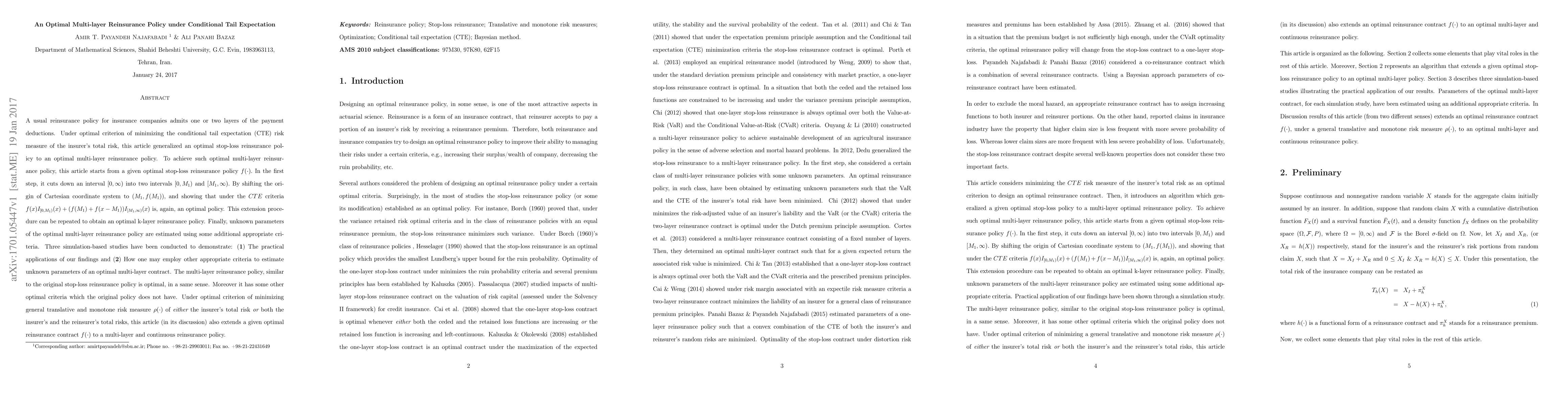 This paper develops an optimal multi-layer reinsurance policy by extending the traditional stop-loss reinsurance policy under the criterion of minimizing the conditional tail expectation (CTE) risk measure. It demonstrates that the multi-layer policy retains optimality and introduces additional criteria for estimating unknown parameters, supported by simulation studies.