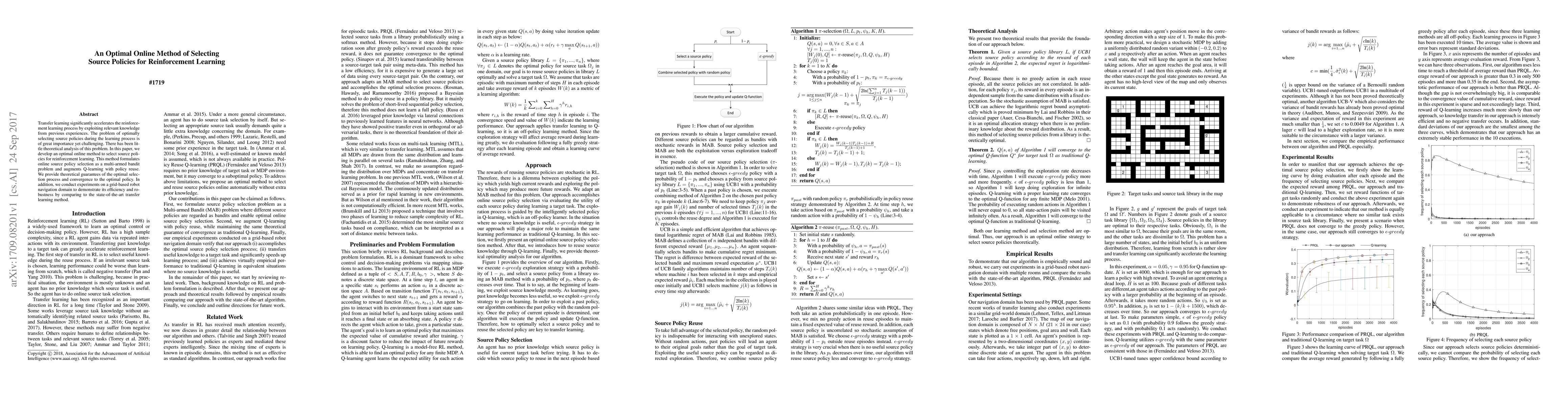 This paper proposes an optimal online method for selecting source policies in reinforcement learning, framing the problem as a multi-armed bandit and integrating Q-learning with policy reuse. Theoretical guarantees for optimal selection and convergence are provided, and experiments demonstrate its efficiency and robustness in a robot navigation domain.