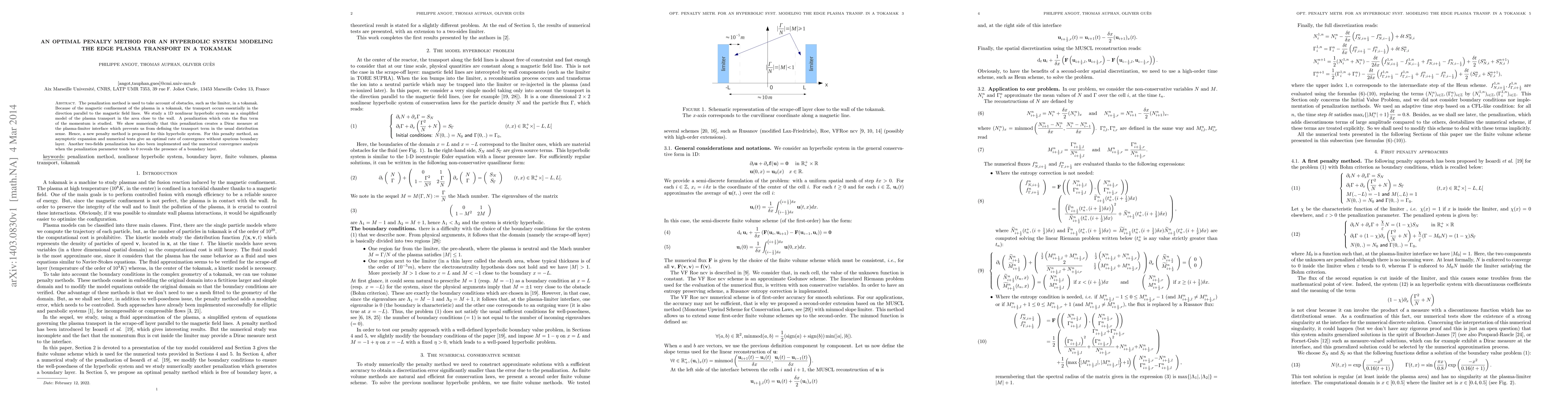 This paper proposes an optimal penalty method for a hyperbolic system modeling plasma transport near the wall in a tokamak, addressing the issue of defining transport terms at the plasma-limiter interface. The new method achieves an optimal convergence rate without spurious boundary layers, contrasting with an alternative two-fields penalization that exhibits a boundary layer.