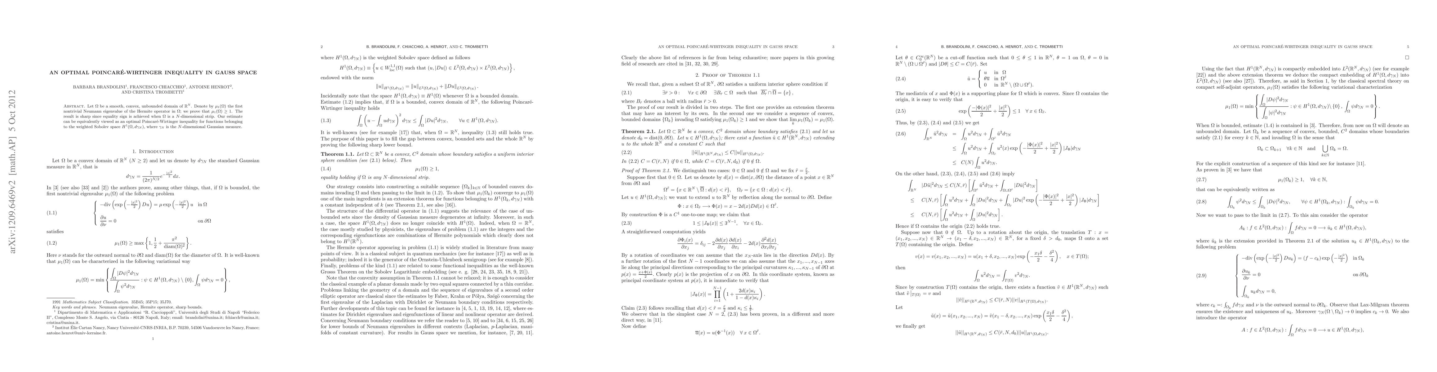 This paper proves an optimal Poincaré-Wirtinger inequality in Gauss space, showing that the first nontrivial Neumann eigenvalue of the Hermite operator in a smooth, convex, unbounded domain $\Omega$ in $\R^N$ is at least 1, with equality achieved when $\Omega$ is an $N$-dimensional strip.