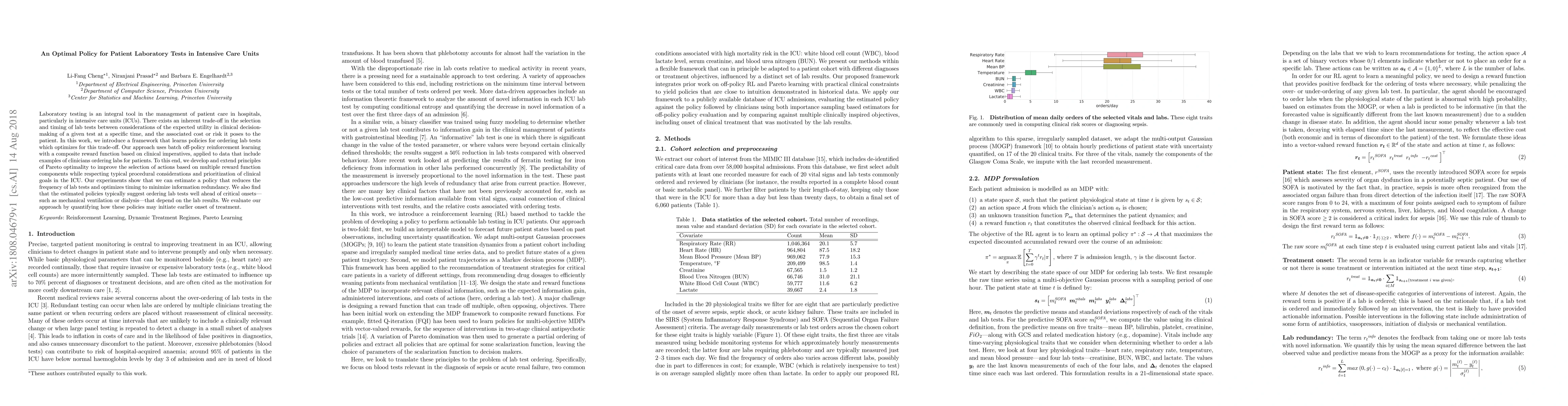This paper introduces a reinforcement learning framework to optimize lab test ordering in ICUs, balancing clinical utility and cost/risk. The approach uses off-policy learning to develop policies that reduce redundancy and suggest tests ahead of critical interventions, potentially initiating earlier treatment.