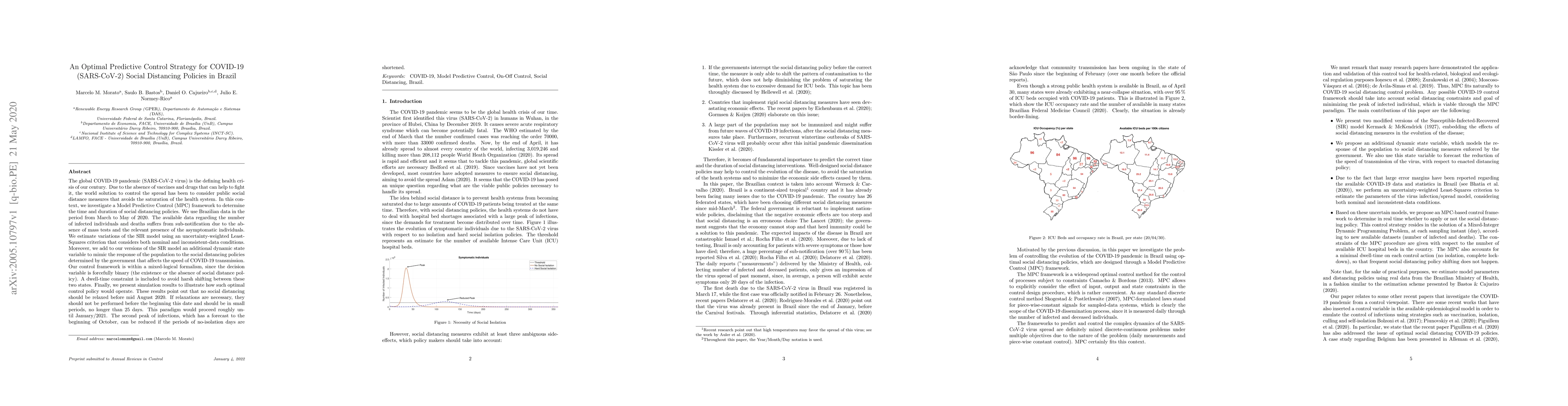 This study proposes an optimal predictive control strategy using Model Predictive Control (MPC) to determine the timing and duration of social distancing policies in Brazil during the COVID-19 pandemic. The research estimates variations of the SIR model with an uncertainty-weighted Least-Squares criterion, incorporating a dynamic state variable to reflect population response to social distancing. Simulation results suggest maintaining strict distancing until mid-August 2020, with gradual and limited relaxations thereafter to mitigate the second infection peak.