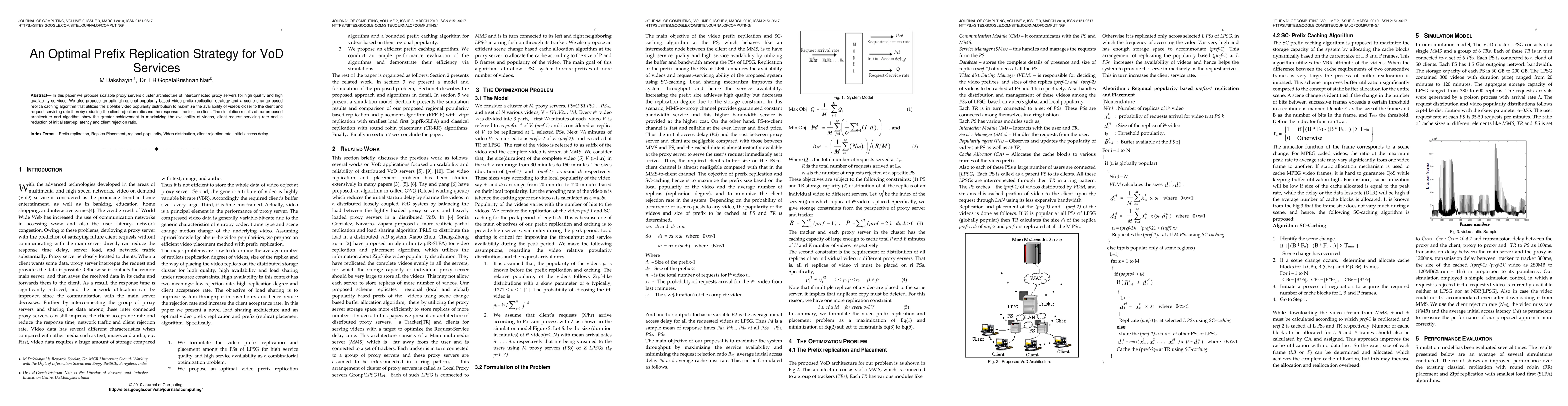 This paper proposes a scalable proxy server cluster architecture to enhance video-on-demand (VoD) service quality and availability. It introduces an optimal regional popularity-based video prefix replication strategy and a scene change-based replica caching algorithm, leveraging Zipf-like popularity distribution to improve video availability, reduce client rejection ratio, and lower response time, with positive simulation results.