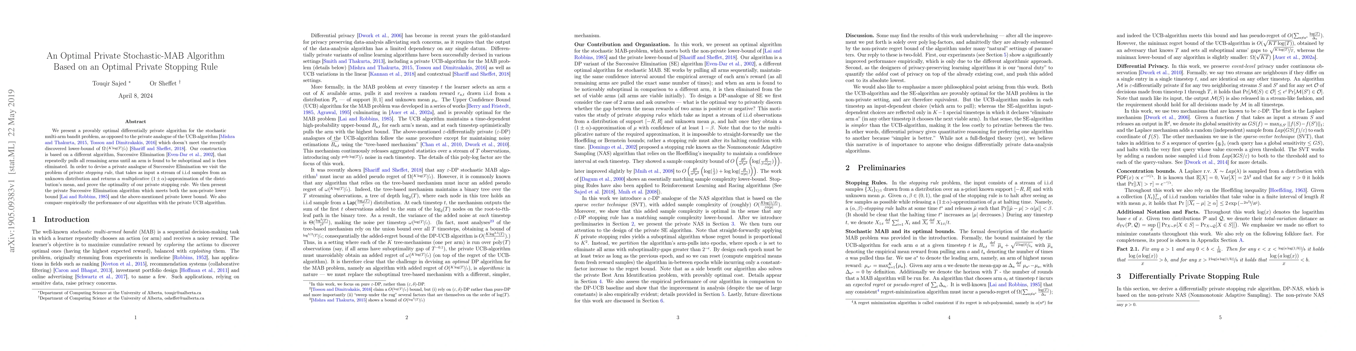 This paper introduces a provably optimal differentially private algorithm for the stochastic multi-arm bandit problem, based on a novel private stopping rule. The proposed private Successive Elimination algorithm meets both the non-private and the recently discovered private lower bounds, outperforming the private UCB algorithm in empirical tests.