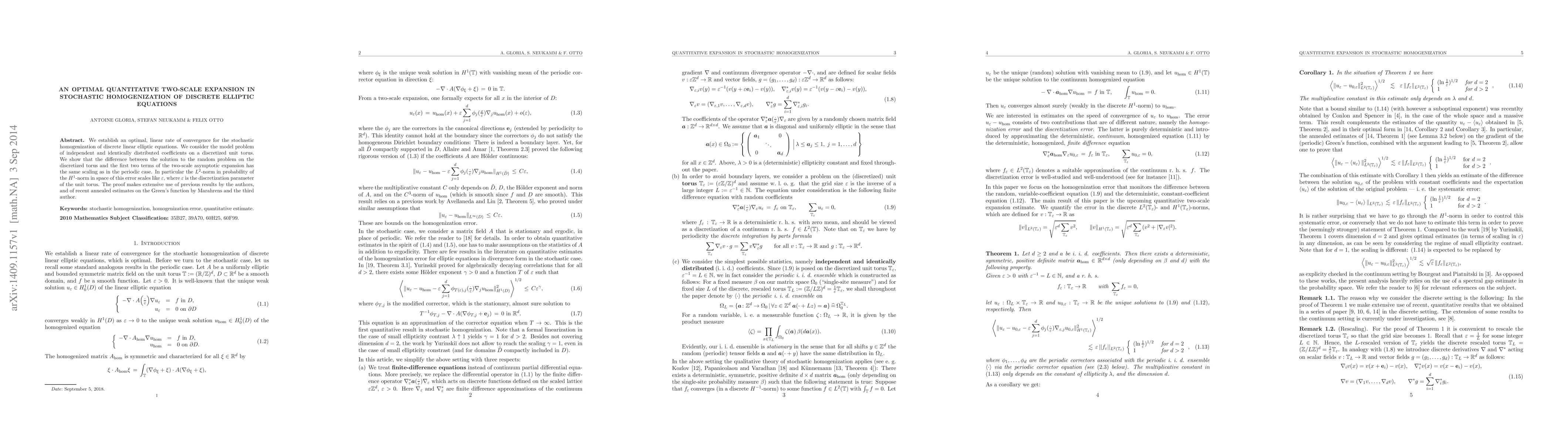 This paper establishes an optimal linear rate of convergence for stochastic homogenization of discrete elliptic equations, showing that the error between the random solution and the first two terms of a two-scale expansion scales as $\epsilon$, where $\epsilon$ is the discretization parameter. The proof leverages previous results and recent estimates on the Green's function.