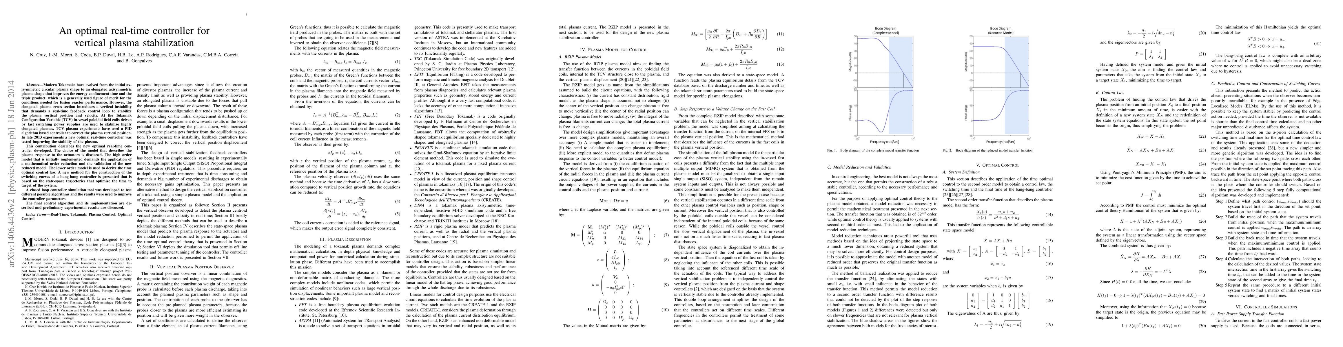 Modern Tokamaks have evolved from the initial axisymmetric circular plasma shape to an elongated axisymmetric plasma shape that improves the energy confinement time and the triple product, which is a generally used figure of merit for the conditions needed for fusion reactor performance. However, the elongated plasma cross section introduces a vertical instability that demands a real-time feedback control loop to stabilize the plasma vertical position and velocity. At the Tokamak \`a Configuration Variable (TCV) in-vessel poloidal field coils driven by fast switching power supplies are used to stabilize highly elongated plasmas. TCV plasma experiments have used a PID algorithm based controller to correct the plasma vertical position. In late 2013 experiments a new optimal real-time controller was tested improving the stability of the plasma. This contribution describes the new optimal real-time controller developed. The choice of the model that describes the plasma response to the actuators is discussed. The high order model that is initially implemented demands the application of a mathematical order reduction and the validation of the new reduced model. The lower order model is used to derive the time optimal control law. A new method for the construction of the switching curves of a bang-bang controller is presented that is based on the state-space trajectories that optimize the time to target of the system. A closed loop controller simulation tool was developed to test different possible algorithms and the results were used to improve the controller parameters. The final control algorithm and its implementation are described and preliminary experimental results are discussed.