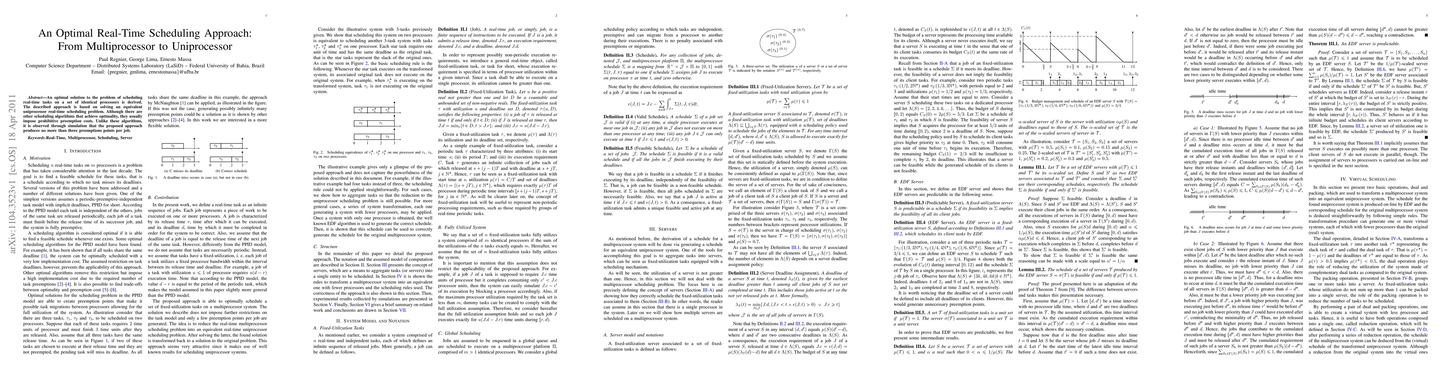 An optimal solution to the problem of scheduling real-time tasks on a set of identical processors is derived. The described approach is based on solving an equivalent uniprocessor real-time scheduling problem. Although there are other scheduling algorithms that achieve optimality, they usually impose prohibitive preemption costs. Unlike these algorithms, it is observed through simulation that the proposed approach produces no more than three preemptions points per job.
