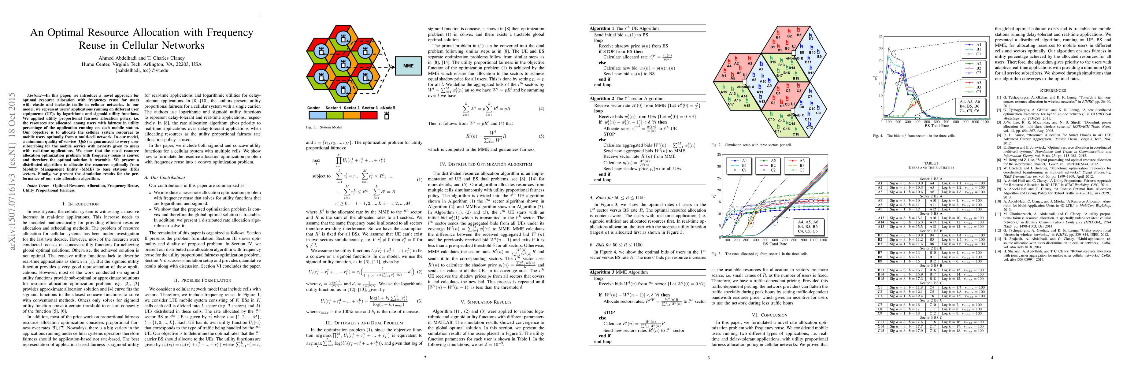 In this paper, we introduce a novel approach for optimal resource allocation with frequency reuse for users with elastic and inelastic traffic in cellular networks. In our model, we represent users' applications running on different user equipments (UE)s by logarithmic and sigmoid utility functions. We applied utility proportional fairness allocation policy, i.e. the resources are allocated among users with fairness in utility percentage of the application running on each mobile station. Our objective is to allocate the cellular system resources to mobile users optimally from a multi-cell network. In our model, a minimum quality-of-service (QoS) is guaranteed to every user subscribing for the mobile service with priority given to users with real-time applications. We show that the novel resource allocation optimization problem with frequency reuse is convex and therefore the optimal solution is tractable. We present a distributed algorithm to allocate the resources optimally from Mobility Management Entity (MME) to base stations (BS)s sectors. Finally, we present the simulation results for the performance of our rate allocation algorithm.